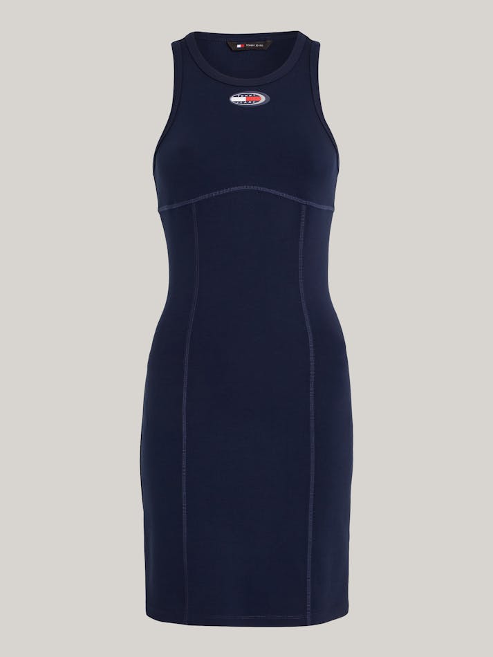 This flattering sleeveless dress has a definite sport-informed retro spirit, with its figure-enhancing bodycon shape and branded detailing.