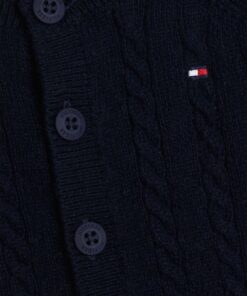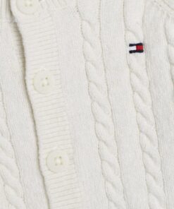 This cosy coordinating set includes a beanie, cardigan and trousers, each made with soft wool to a classic cable-knit design.