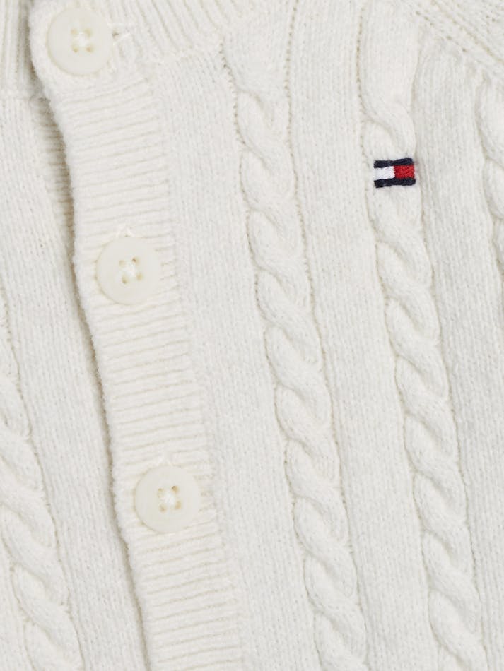 This cosy coordinating set includes a beanie, cardigan and trousers, each made with soft wool to a classic cable-knit design.