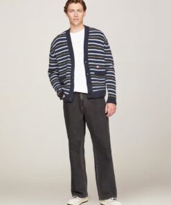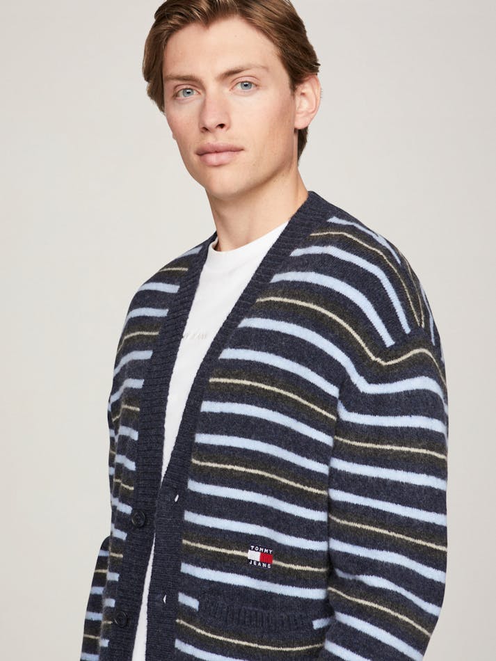 This boxy jacquard cardigan makes for an easy extra layer on chilly days, crafted from a cosy wool blend and finished with an all-over stripe.