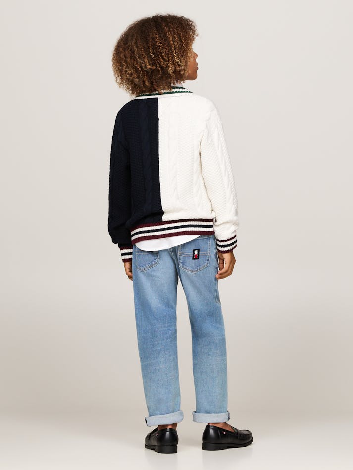 This cotton-rich jumper is made with wool for a luxe touch and features a colour-blocked, cable-knit design to create a sports-informed look.
