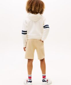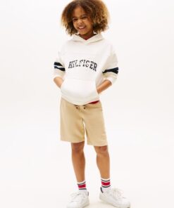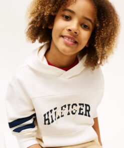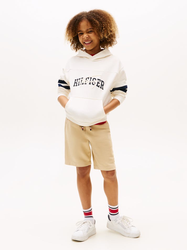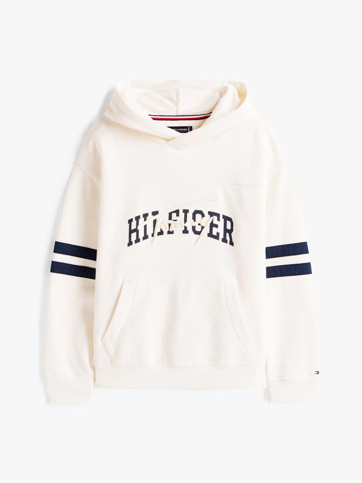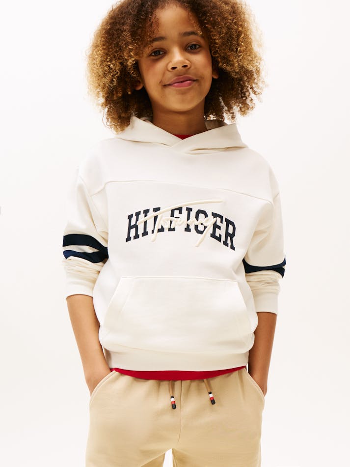 This cosy pure cotton hoody features a combination of embroidered and graphic logos on the chest and sporty stripes on the sleeves.