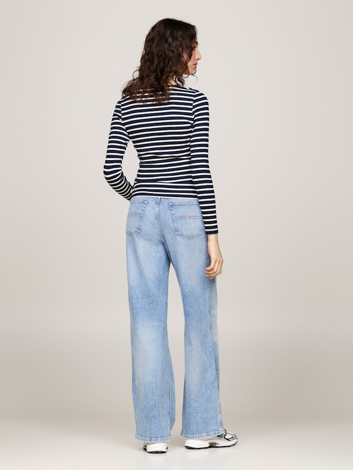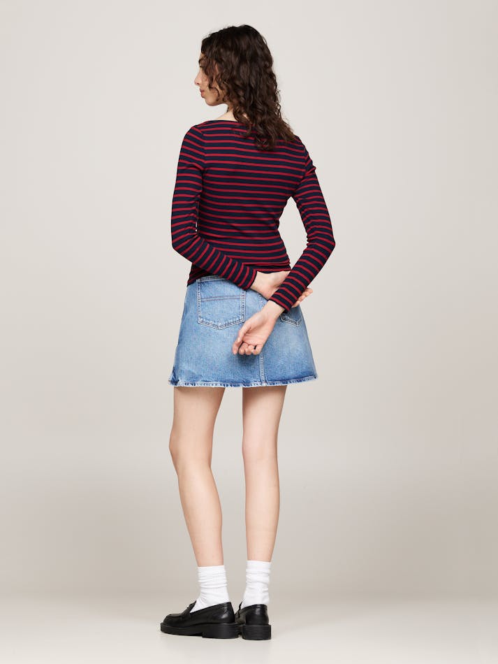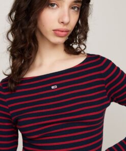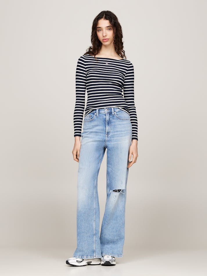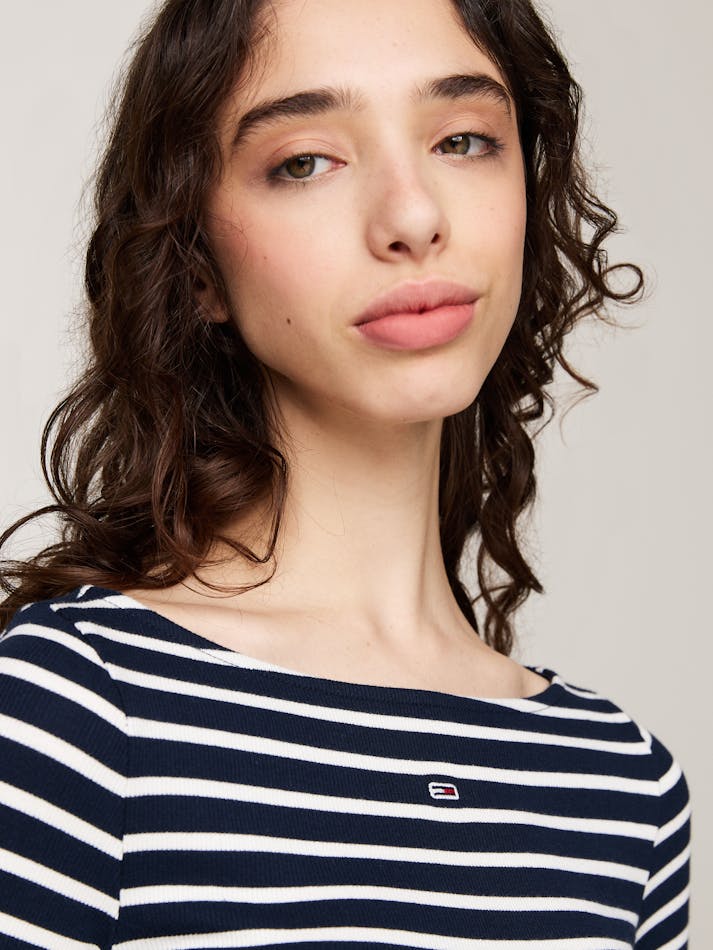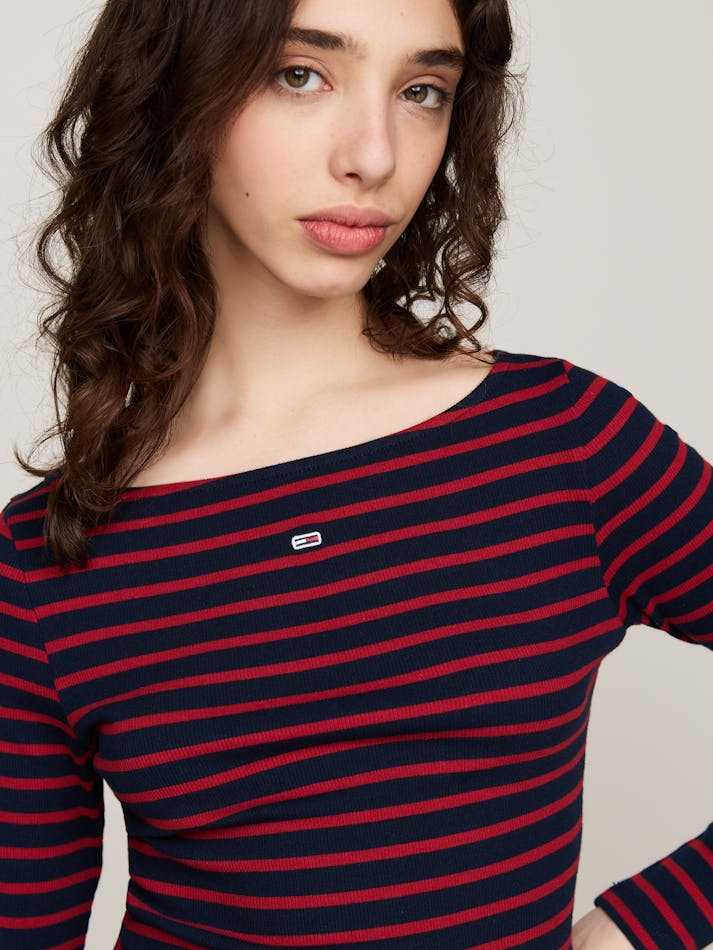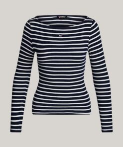 This long-sleeved top combines a distinctive Breton stripe design with an elegant boat neckline for a timelessly flattering silhouette.