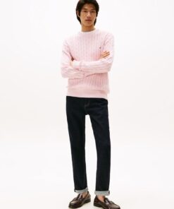 For that lived-in look, turn to our garment-dyed range. The colour is applied after the clothes have been constructed for a vintage appearance. This classic jumper features an intricate cable-knit design with flag embroidery and is garment-dyed for a washed-out look.