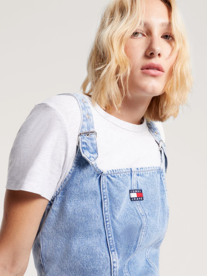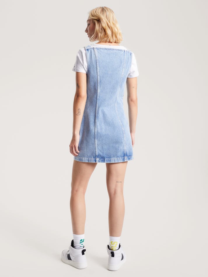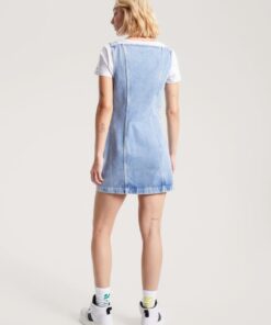 This denim dress is cut to a figure-flattering mini length and features fading details for a vintage look.