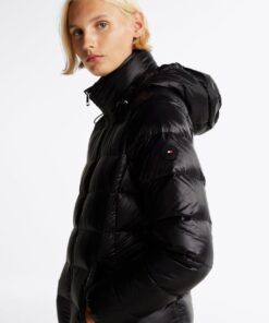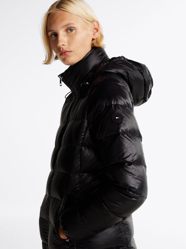 DOWN-FILLED GLOSSY HOODED PUFFER COAT