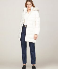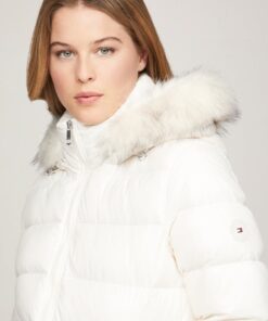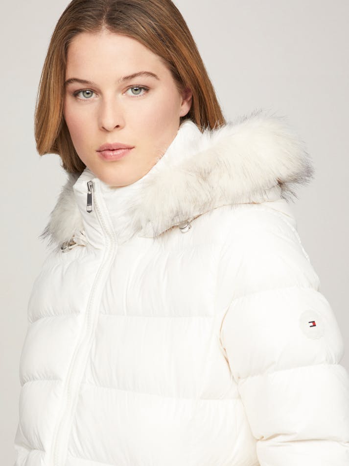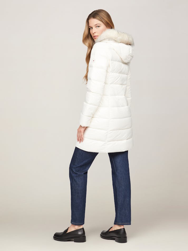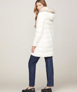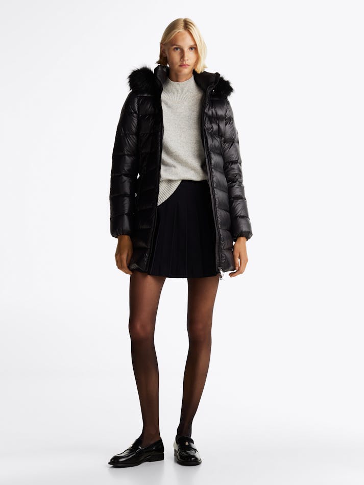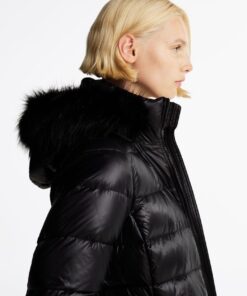Dash out into the rain with chic pieces from the Water Repellent collection. A glossy, water-repellent finish and a removable faux fur trim on the hood amps up the glamour of this practical down-filled coat.