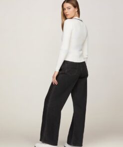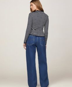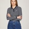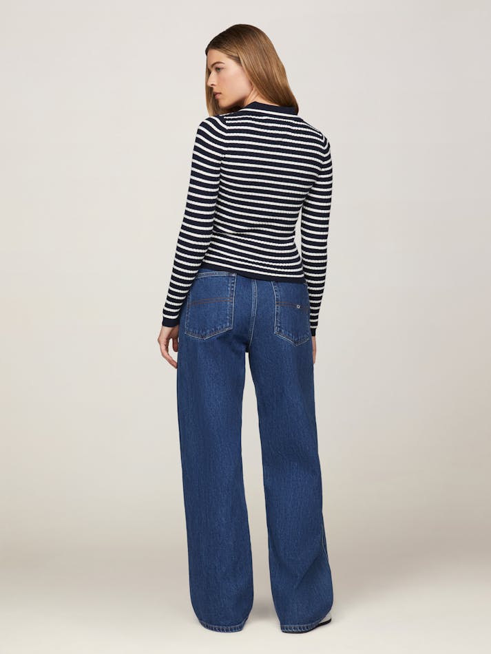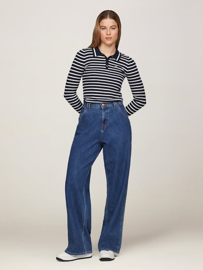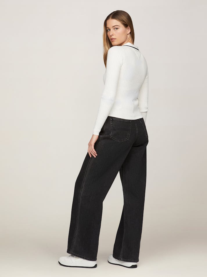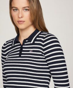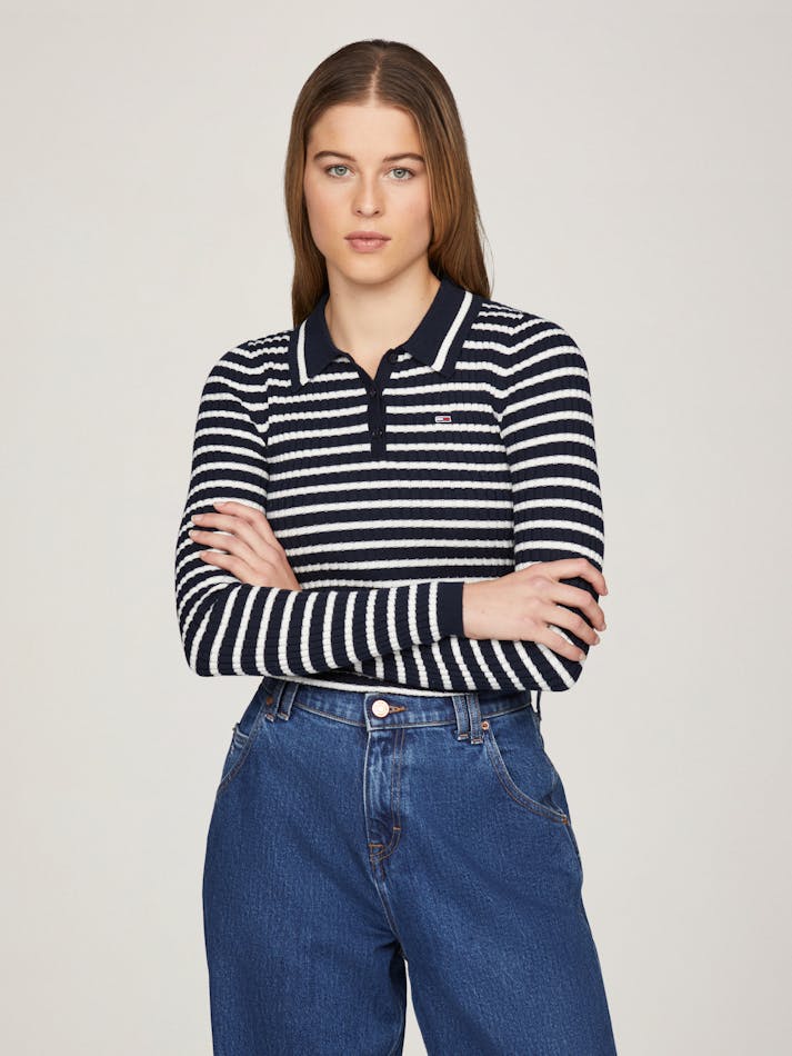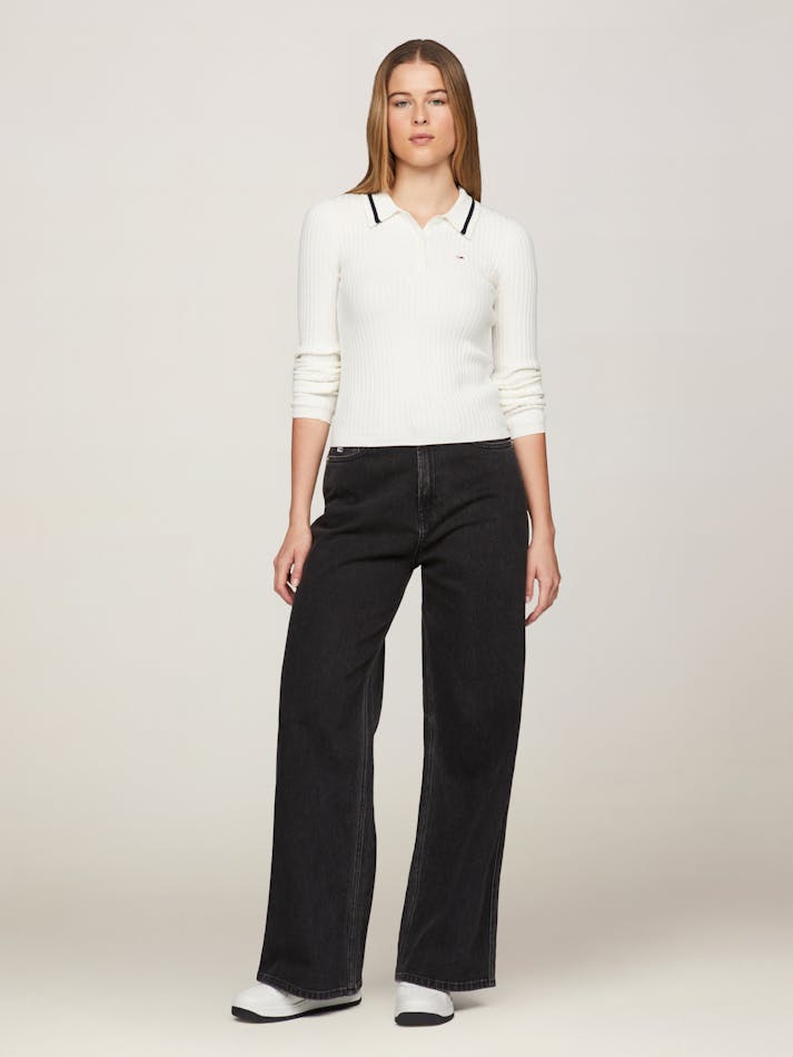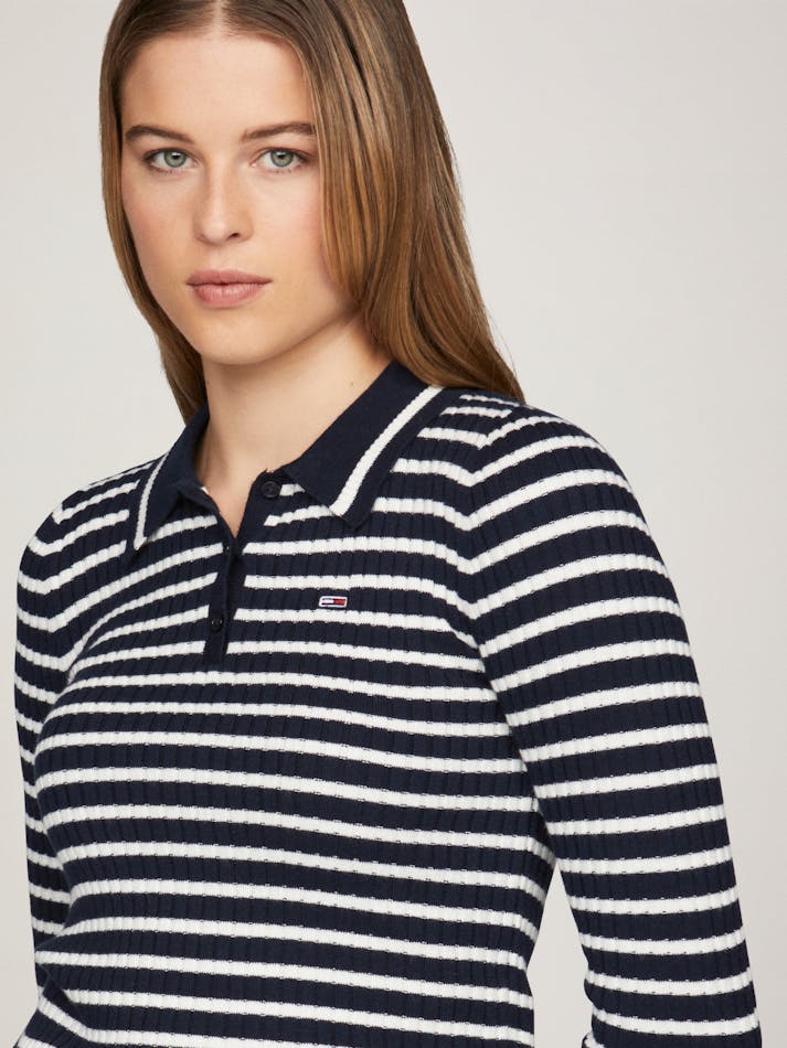 Sporty and refined, this rib knit sweater features a classic polo collar with a contrast stripe and the signature flag embroidery on the chest.