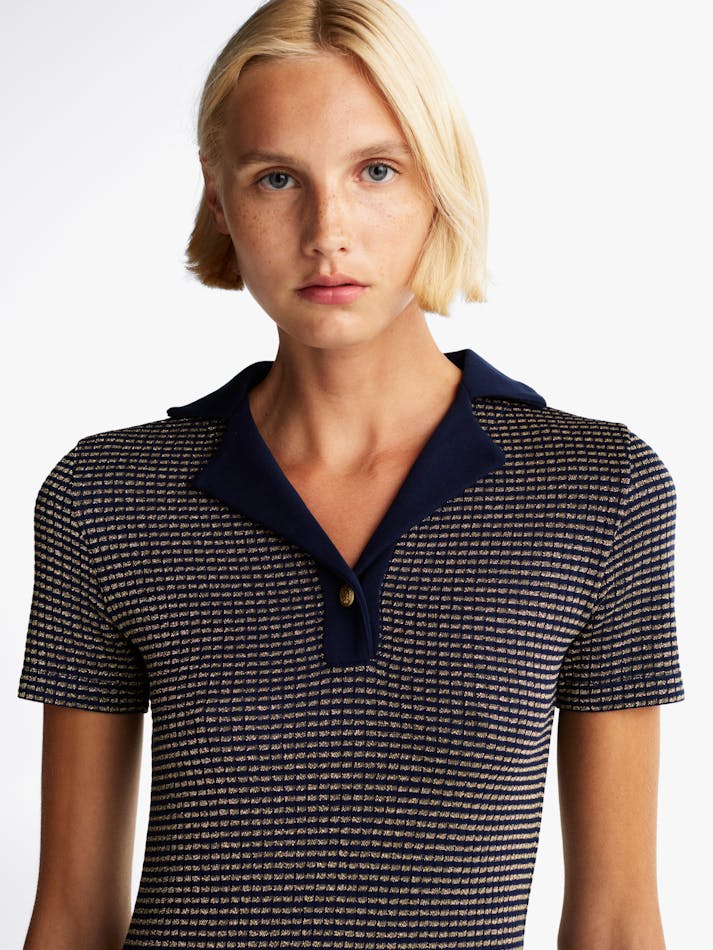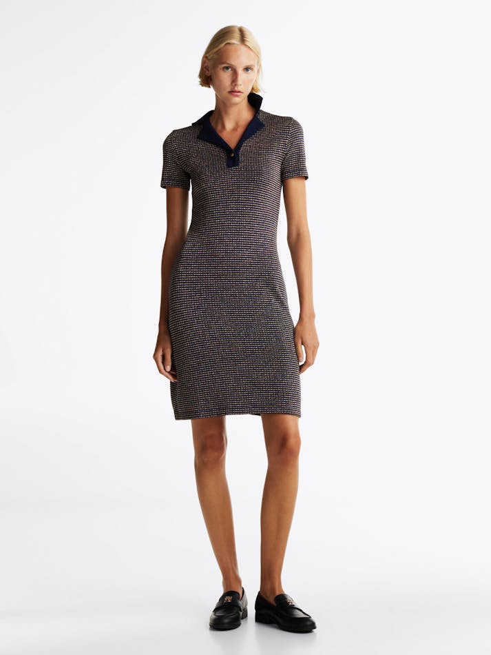 This polo dress is the perfect style to take you from day to evening with its metallic detailing and embossed button embellishment.