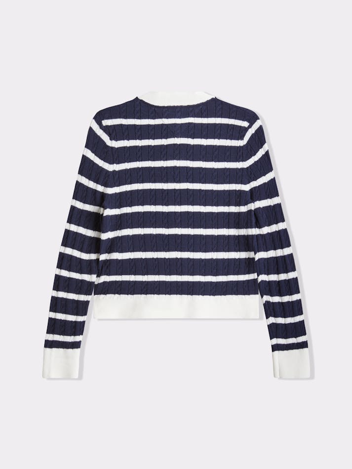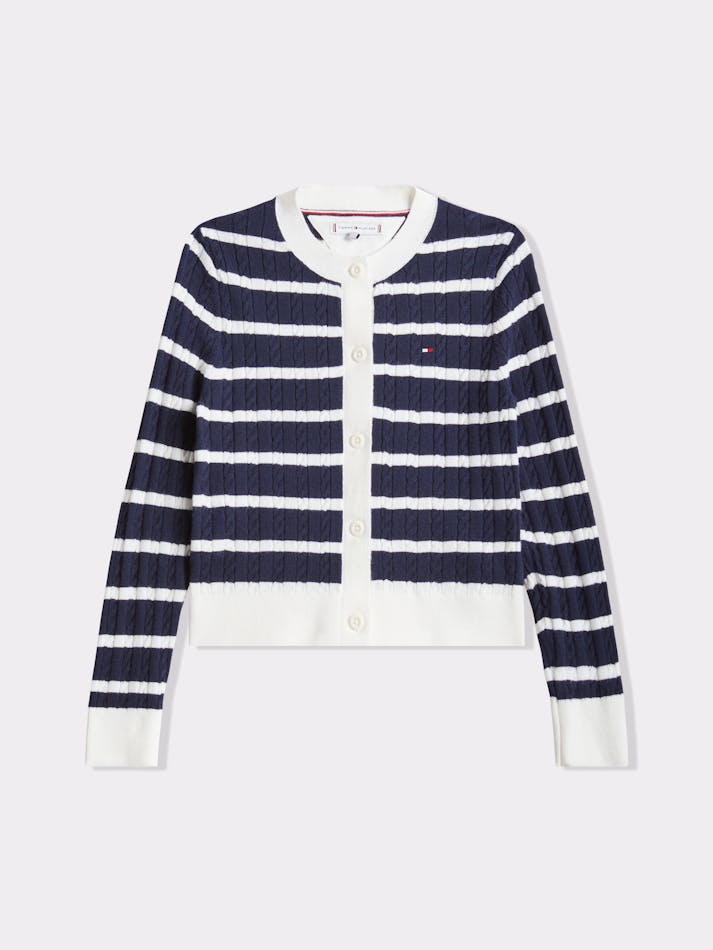 This cosy cable knit cardigan is made from a soft viscose blend, featuring an all-over stripe and Tommy Hilfiger flag embroidery on the chest for a stylish finish.