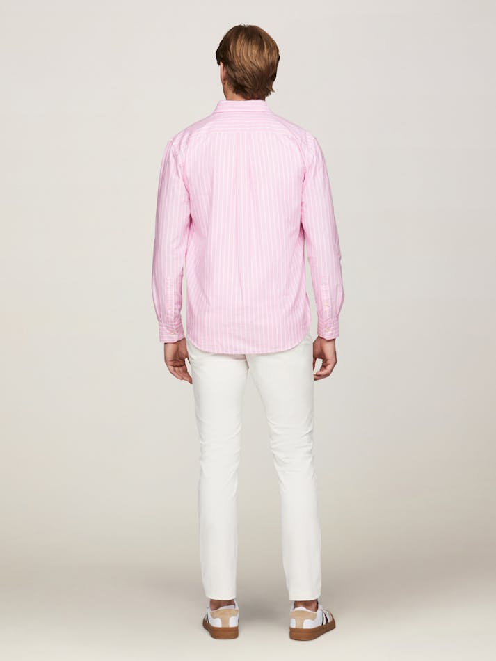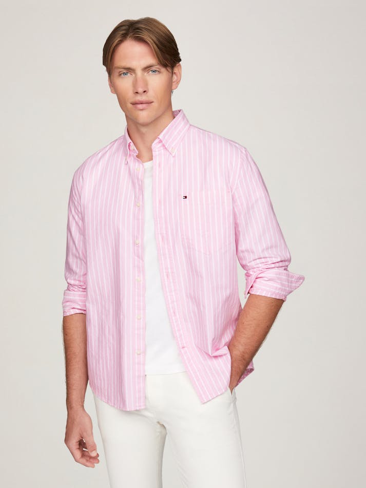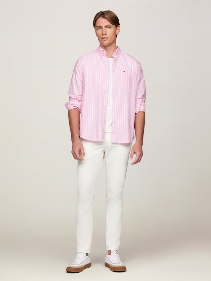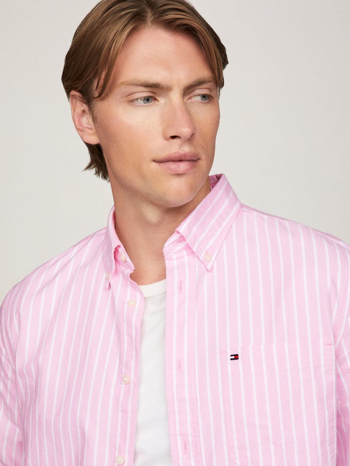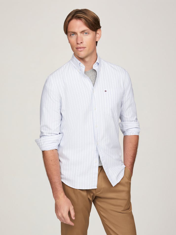 This versatile oxford shirt is perfect to take you from day to evening with its subtle vertical stripe and sharp button down front.