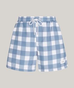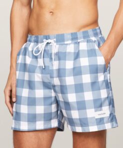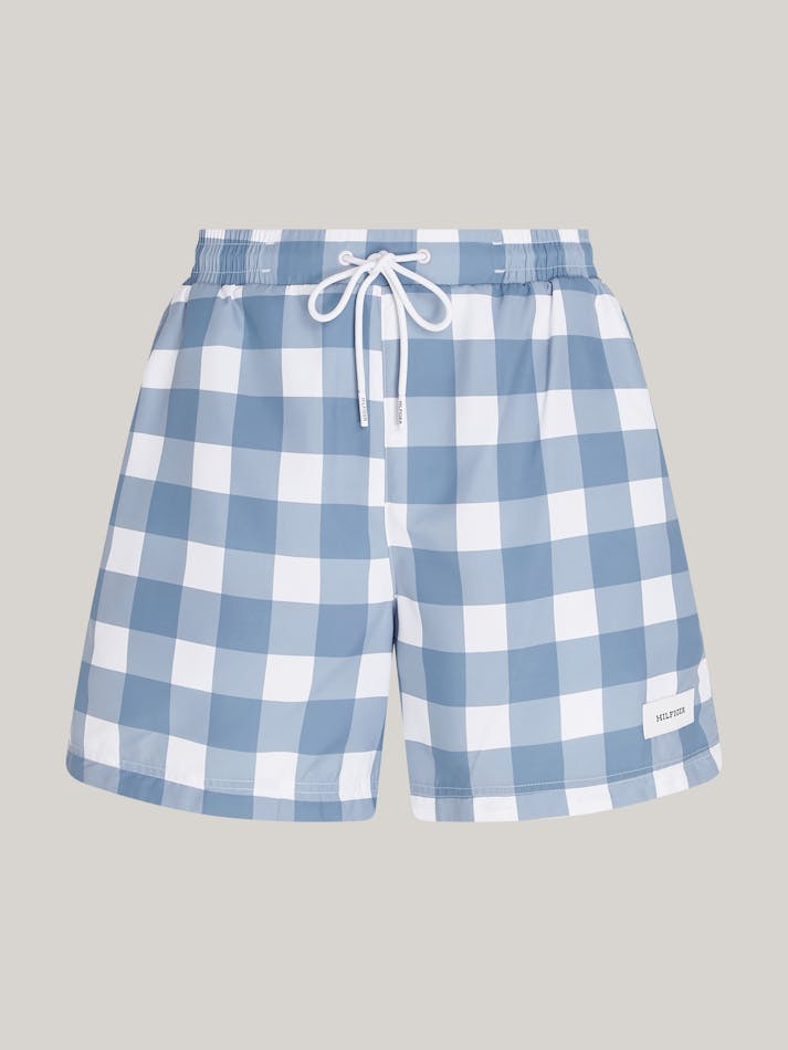 A vintage-inspired gingham check brings a fresh feel to these mid-length swim shorts featuring a comfortable drawstring waist.