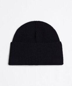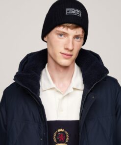 A Hilfiger monotype logo patch on the turn-up cuff brings an outdoors-inspired look to this ribbed pure wool beanie hat.
