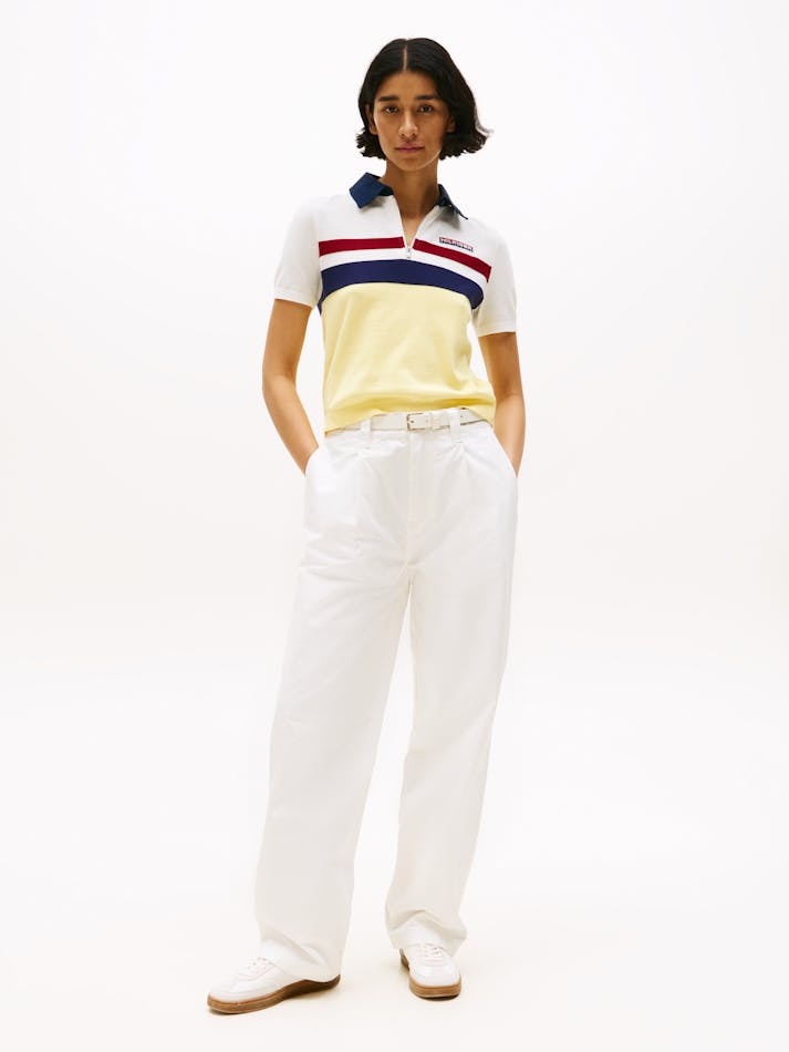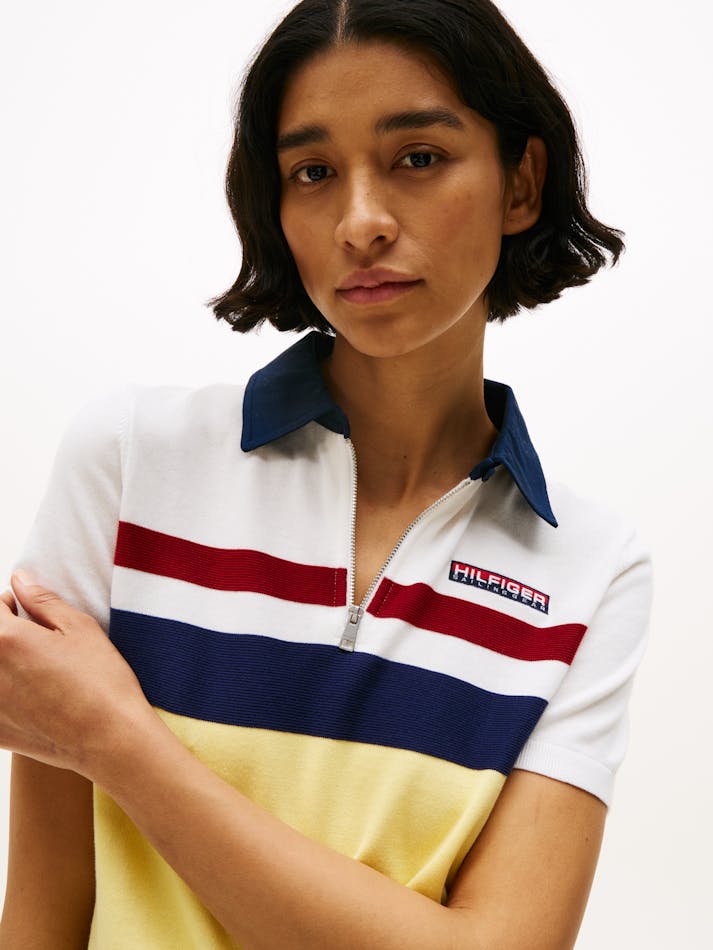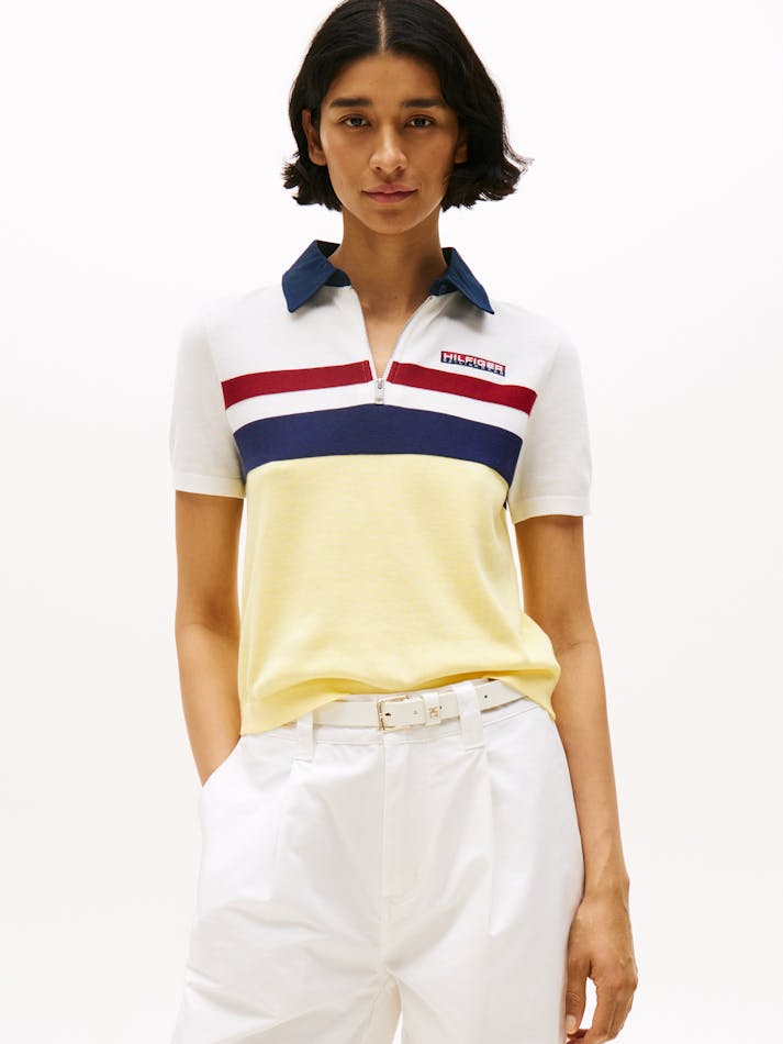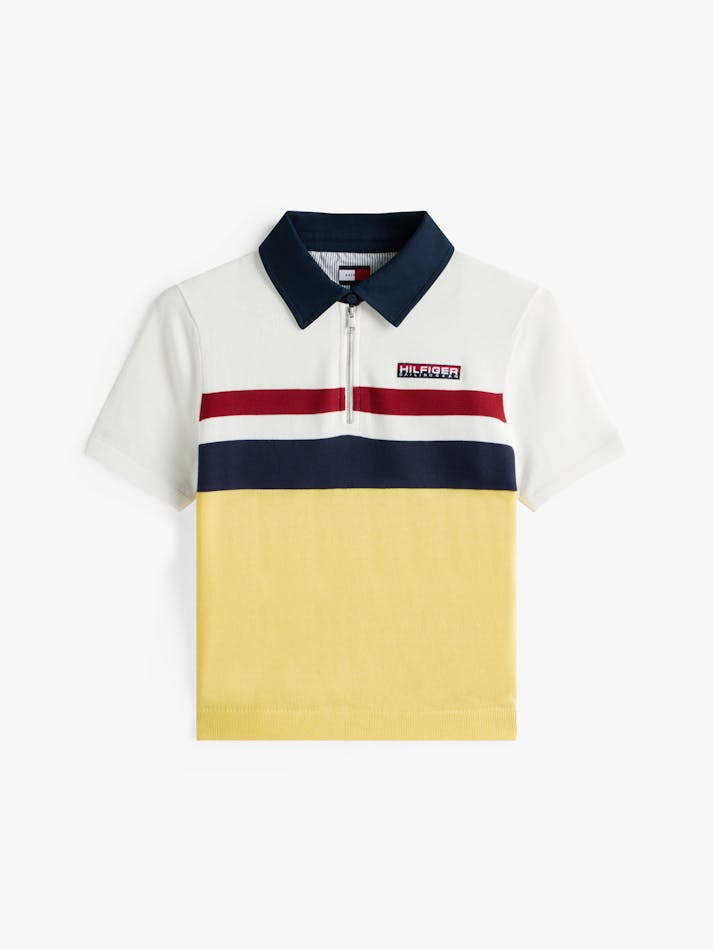The classic polo shirt gets a refreshing makeover with this colour-blocked style, which features a zip placket inspired by archival designs.