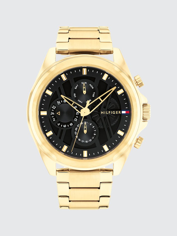 Introducing the Tommy Hilfiger men’s watch a bold statement of sporty sophistication. At its core lies a dimensional double-layer dial, a striking visual masterpiece that captures the essence of boldness and innovation. Oversized hands dominate the face, adding a touch of rugged charm to its athletic-inspired design. Sub-eyes positioned at 12, 6, and 9 o’clock offer multifunctional versatility, while stamped gear detail at the 4 o’clock position. It is a multifunction dial, featuring weekday, 24-hour, and date sub-eyes. Crafted for the modern man who embraces adventure and dares to stand out, this timepiece exudes confidence and unparalleled style.