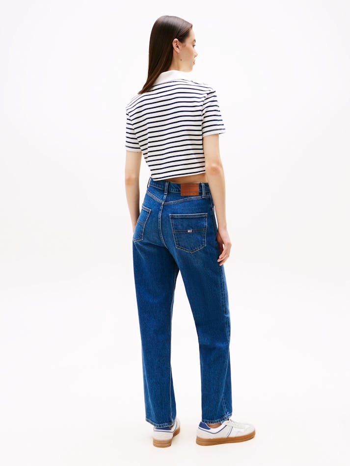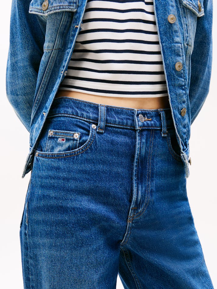Designed with a high rise and slim straight leg, these jeans feature a mid-blue wash and soft fading for a relaxed vibe. The stretch cotton blend ensures comfort, while Tommy Jeans branding adds a signature touch.