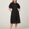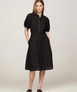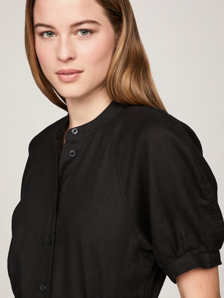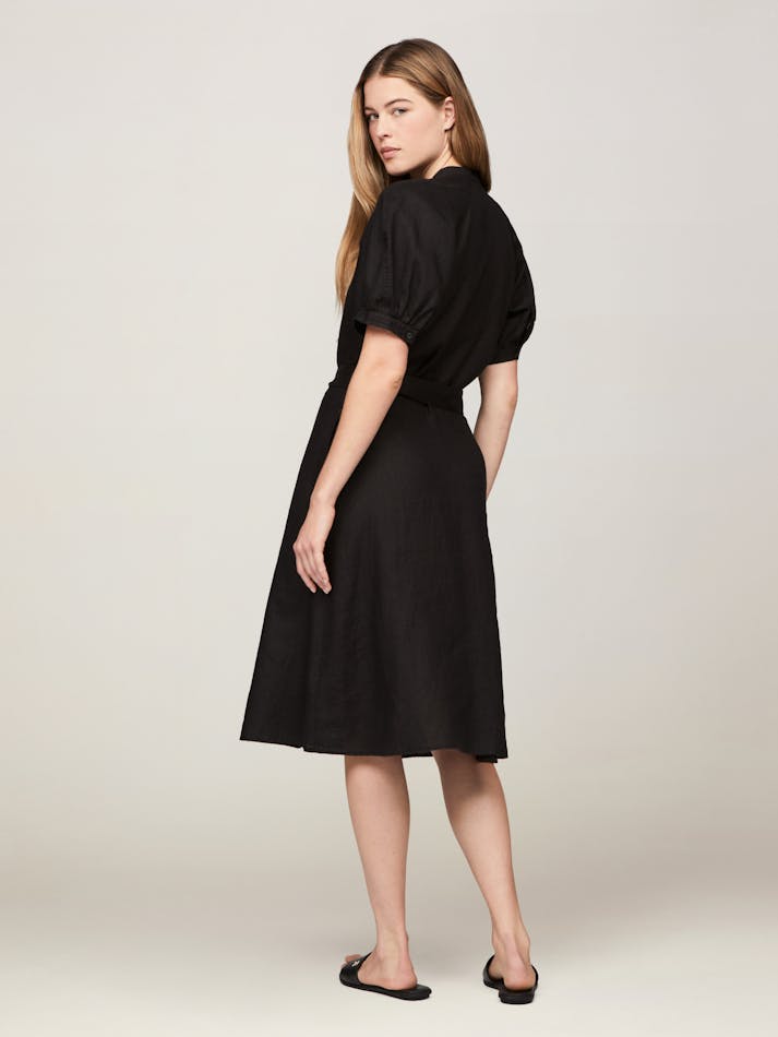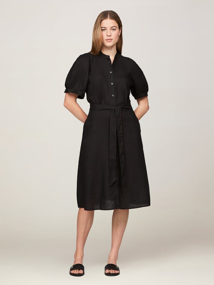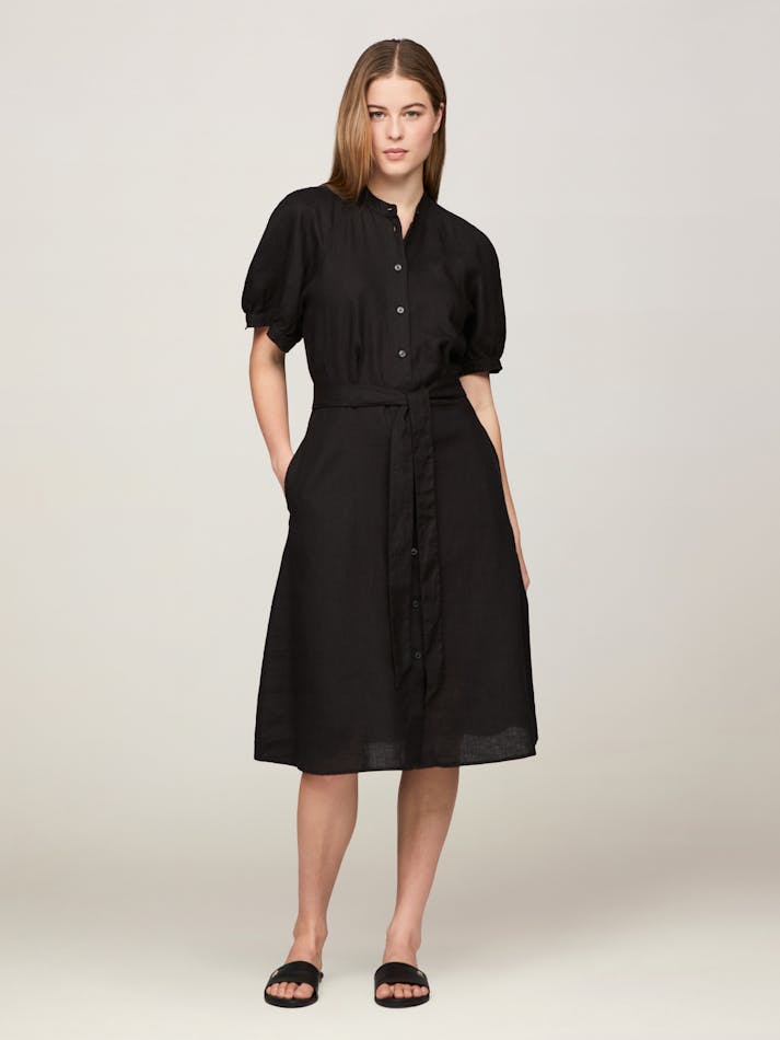 Floaty and breezy, this pure linen shirt dress features a button front, charming puff sleeves and belted tie waist to accentuate the flattering silhouette.
