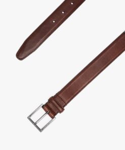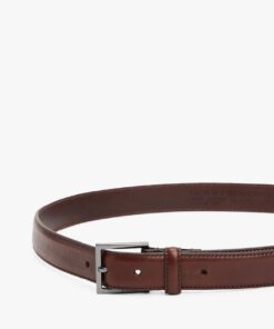 Add a sophisticated touch to any outfit with this shiny leather belt featuring a square metal buckle and a debossed logo.