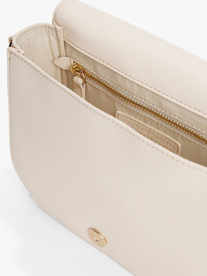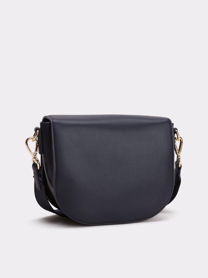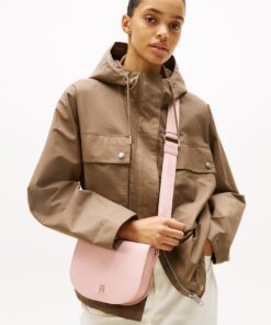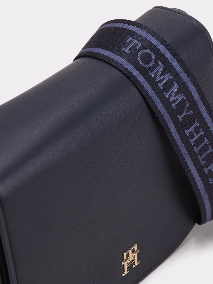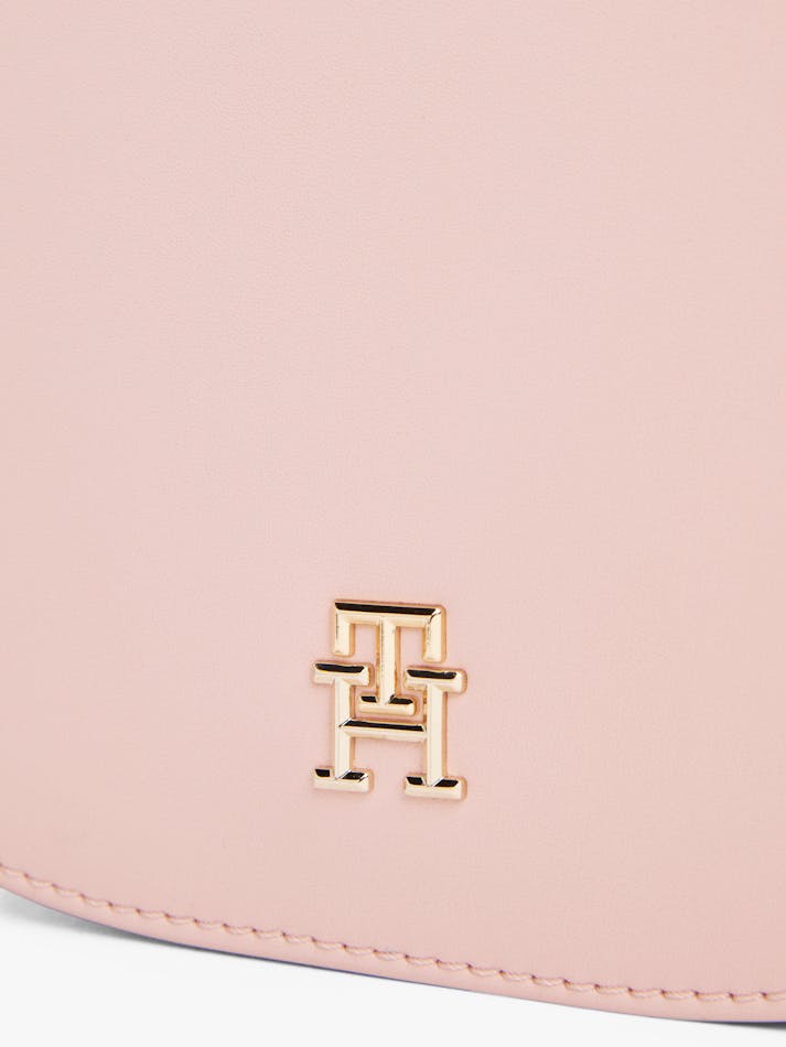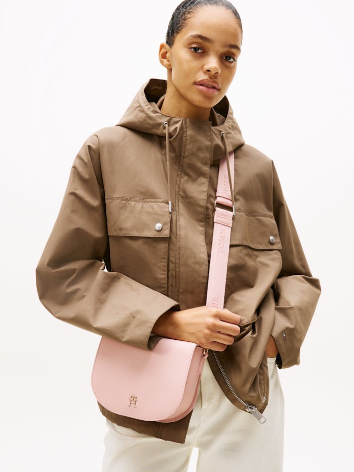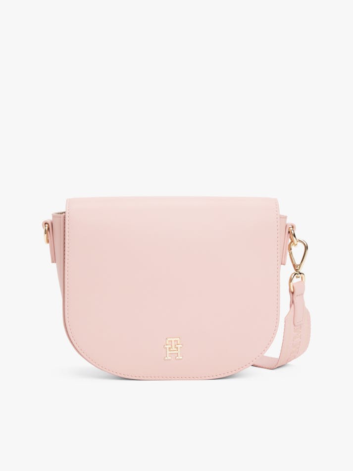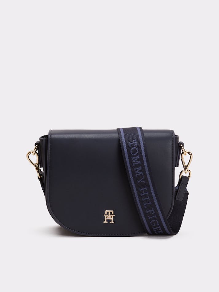 This crossbody saddle bag is an effortless choice for weekends, featuring a repeat logo webbing strap and a glistening TH monogram plaque.