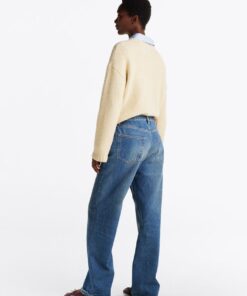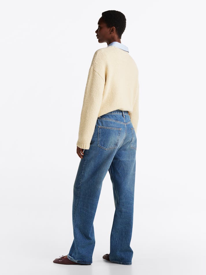 The straight leg and easy loose cut of these rigid denim jeans are complemented by fading and whiskered details.