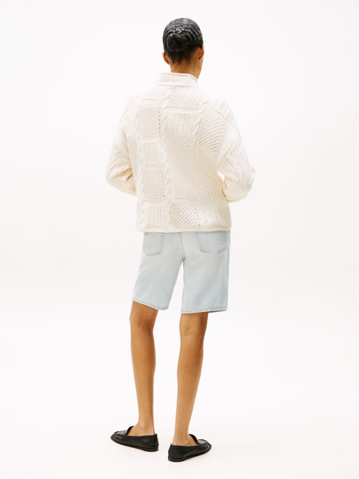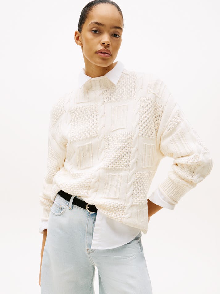 This relaxed mock neck jumper features a tonal flag design within its patchwork of knits, for subtly stylish branding.