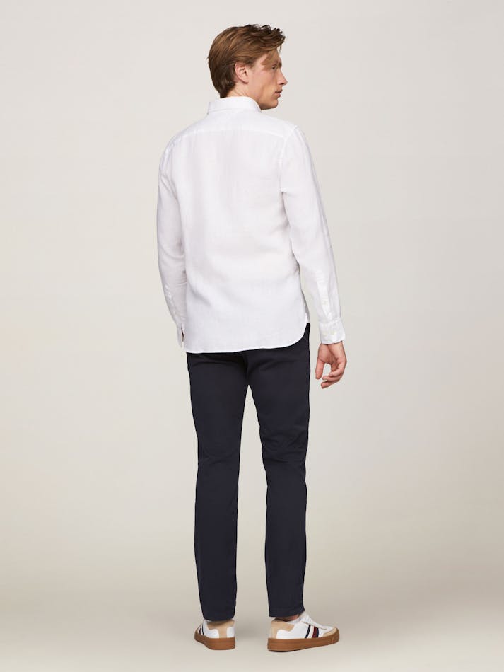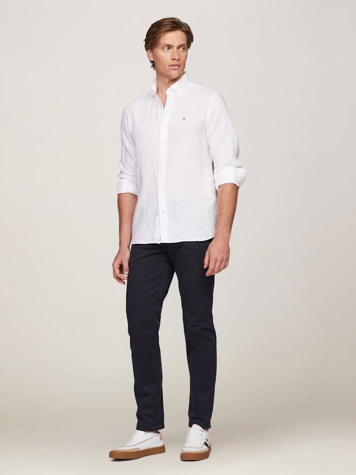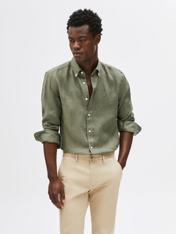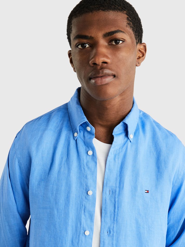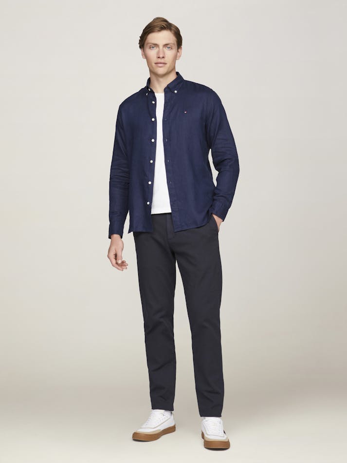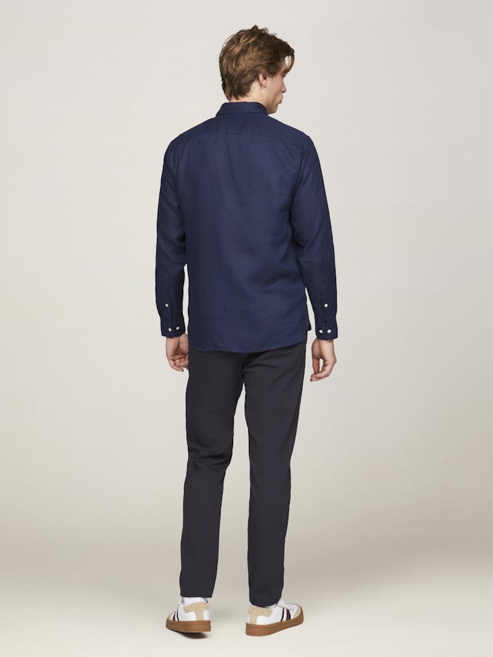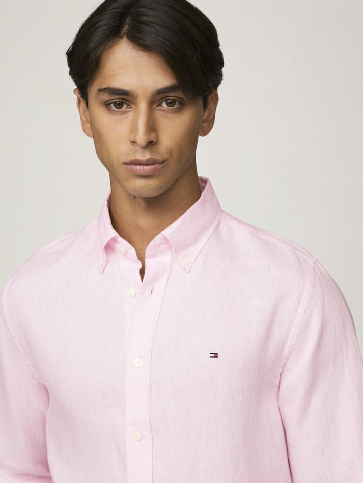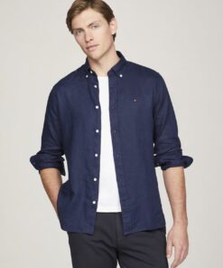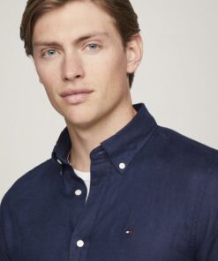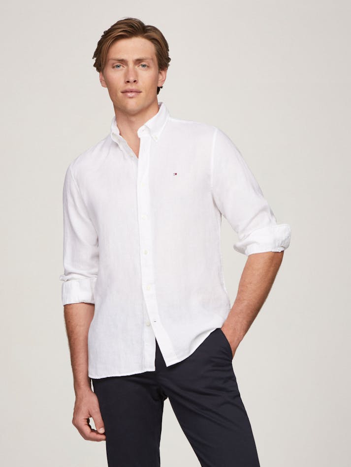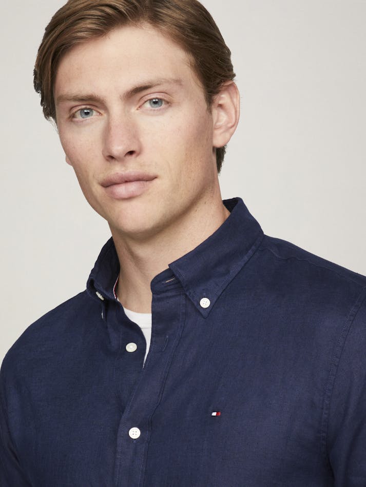 Crafted from pure linen, this shirt features Tommy Hilfiger flag embroidery on the pocket and a button down collar, perfect for transeasonal weather.