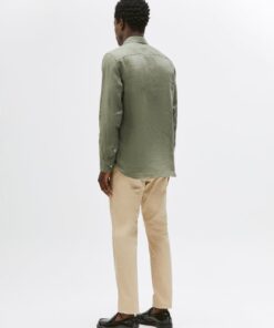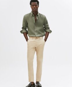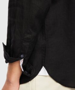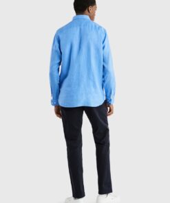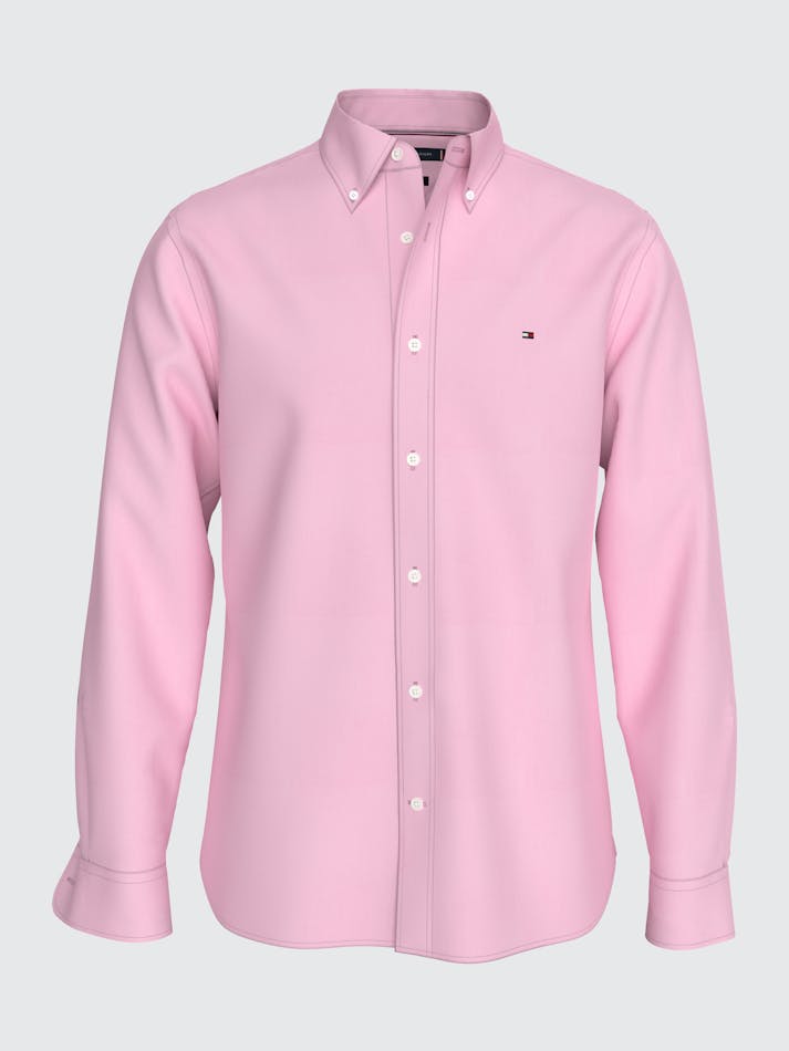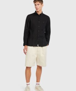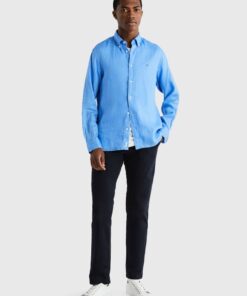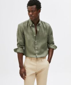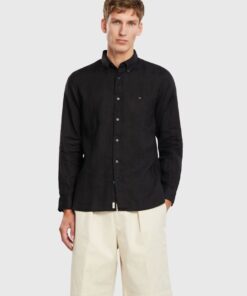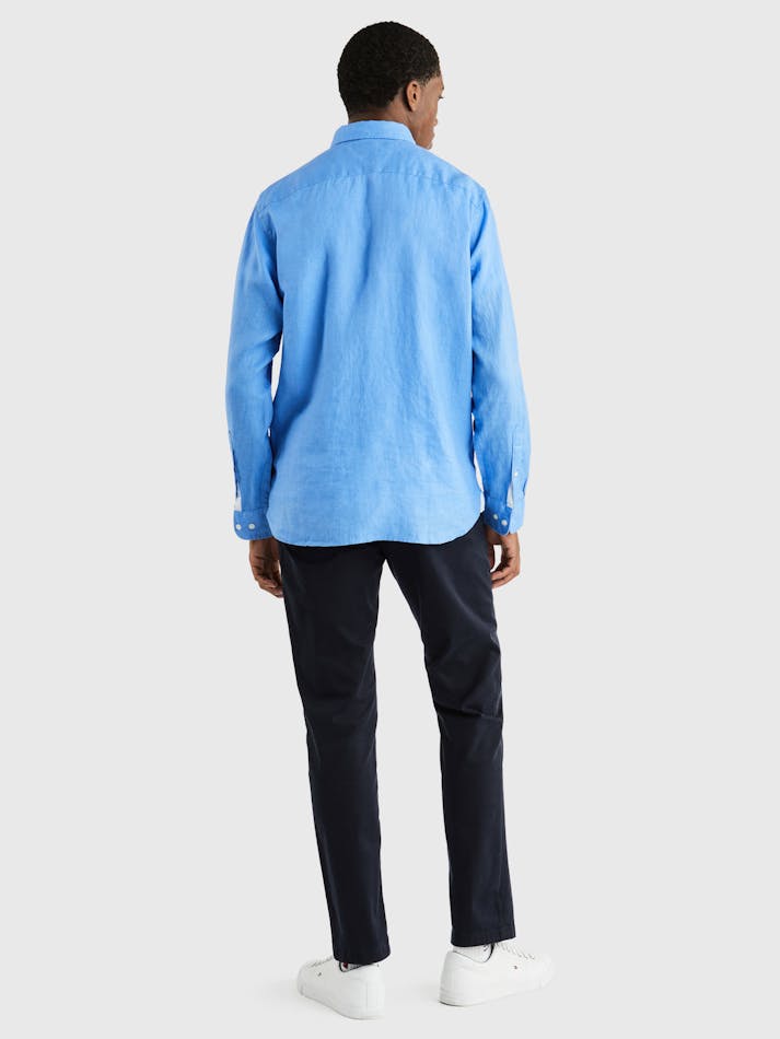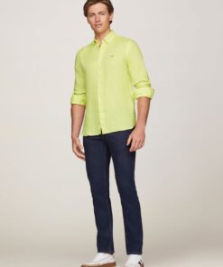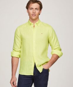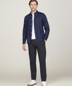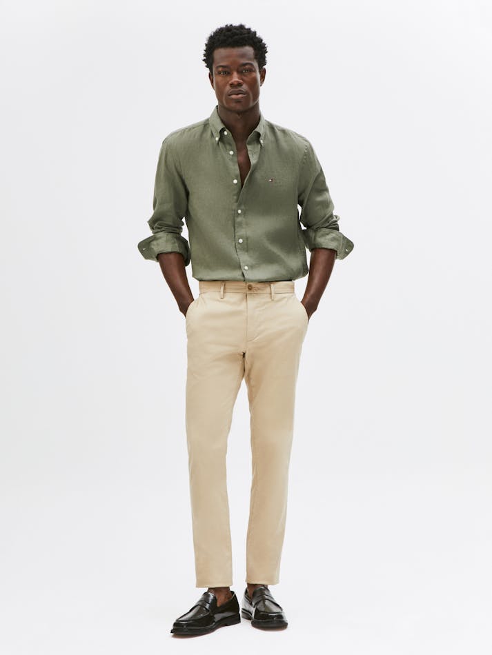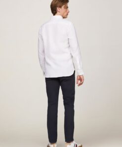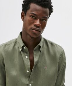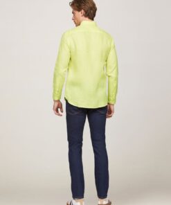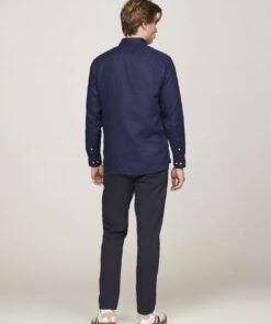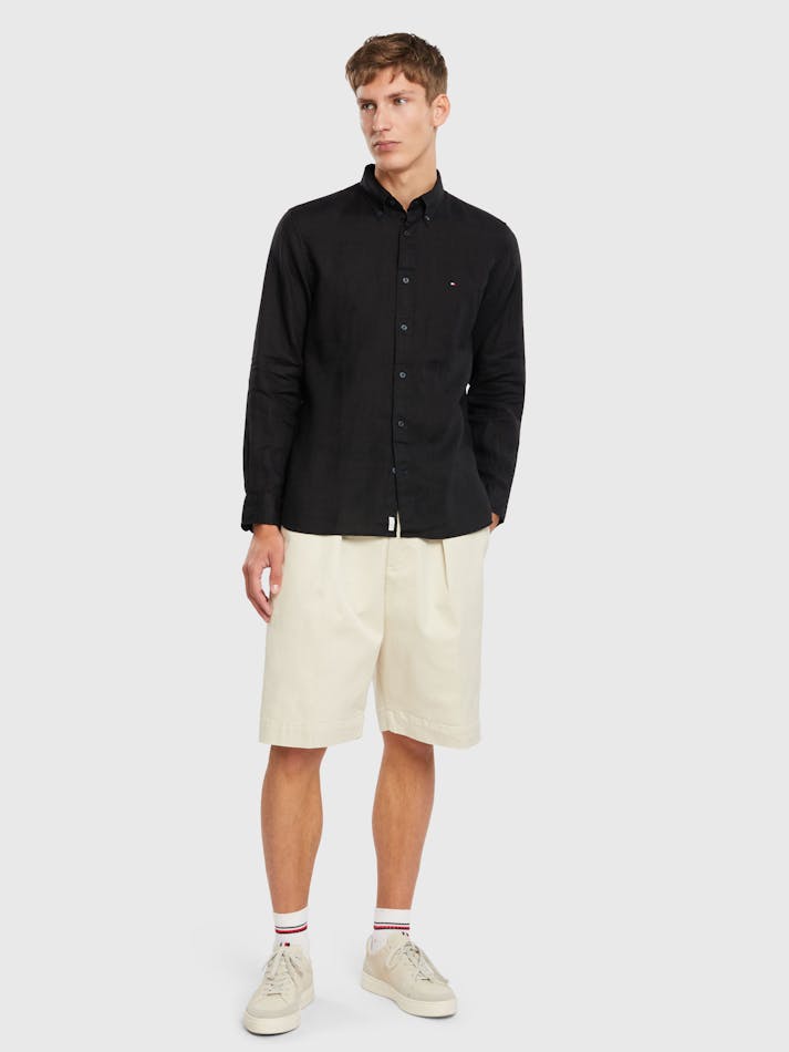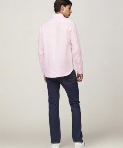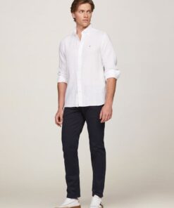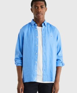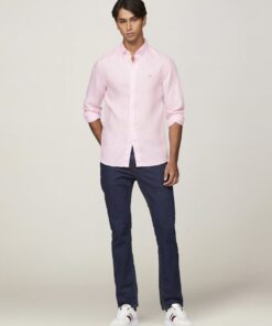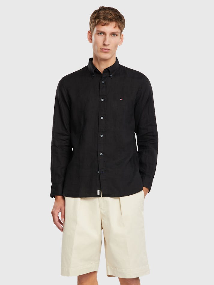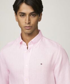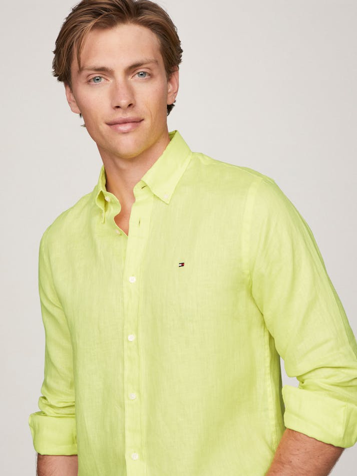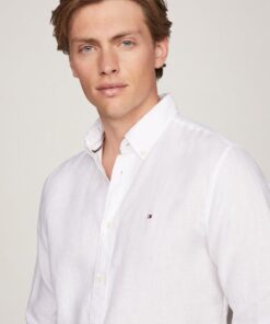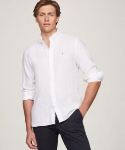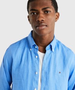 Crafted from pure linen, this shirt features Tommy Hilfiger flag embroidery on the pocket and a button down collar, perfect for transeasonal weather.