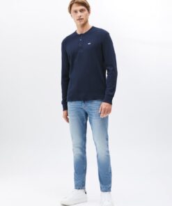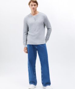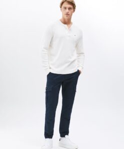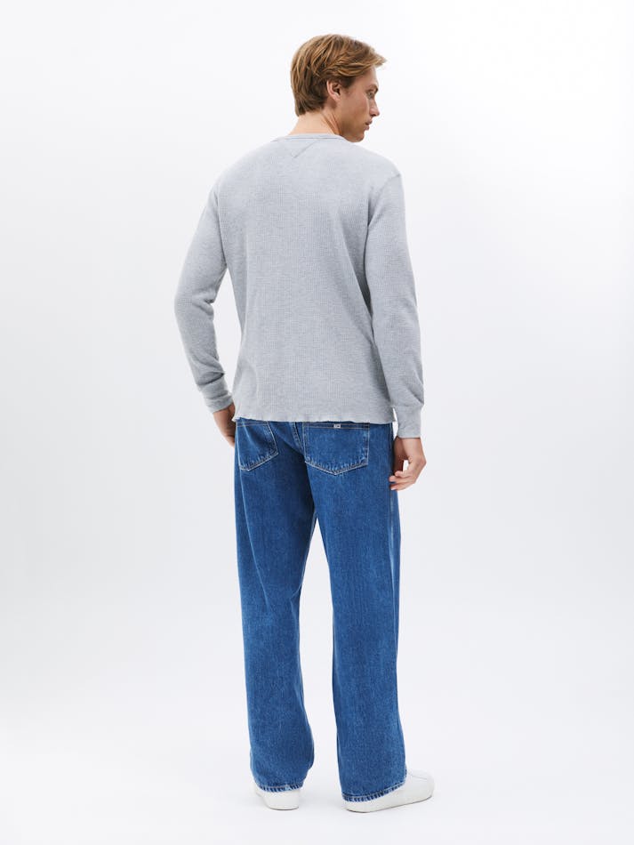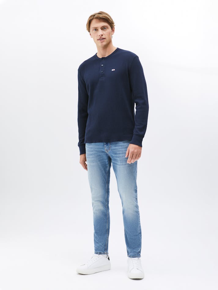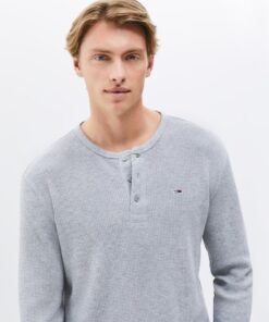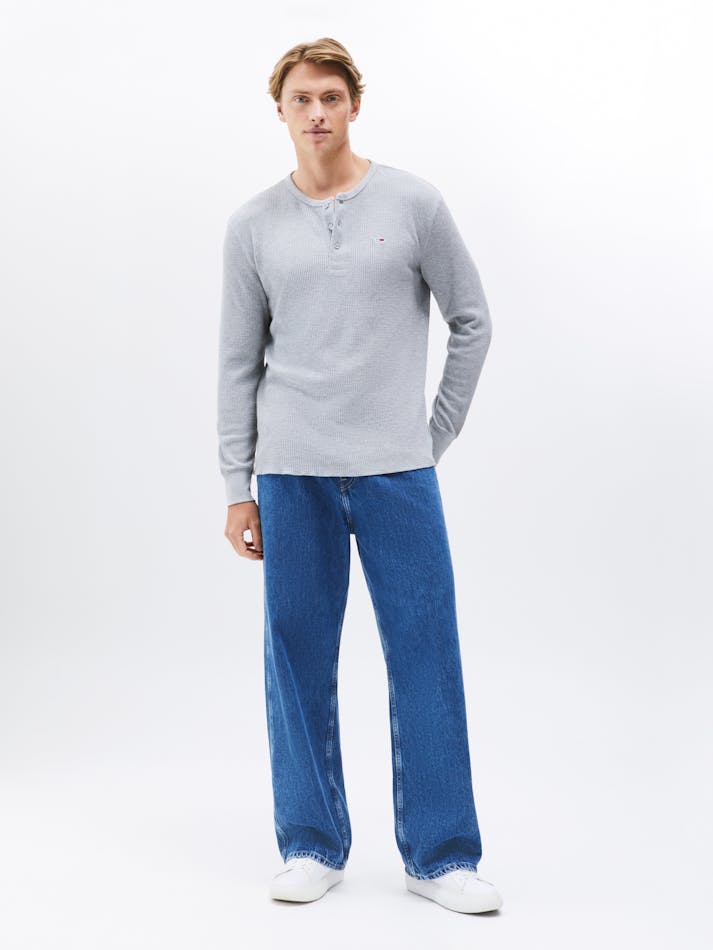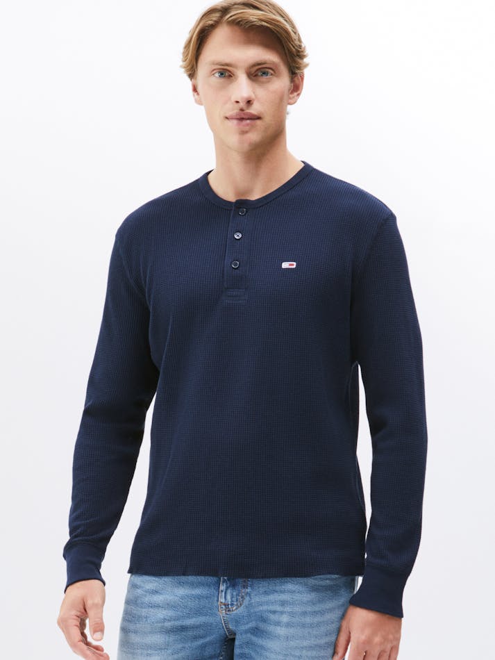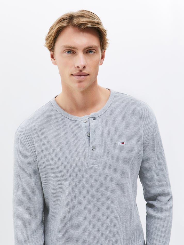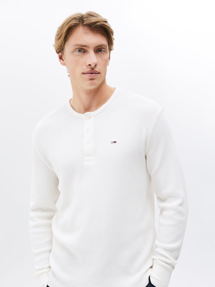 The waffle knit texture brings a cosy feel to this henley neck tee, featuring long sleeves and Tommy Jeans flag embroidery to finish the look.