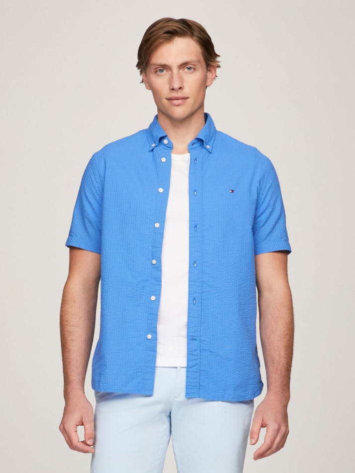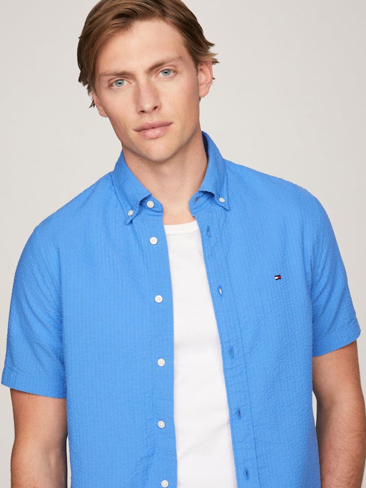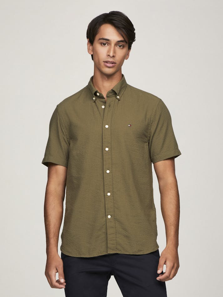 Pure cotton seersucker offers premium comfort to this short sleeve shirt, featuring a smart button down front and flag embroidery on the chest.