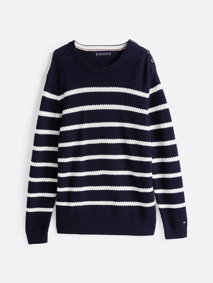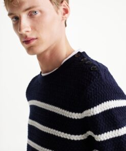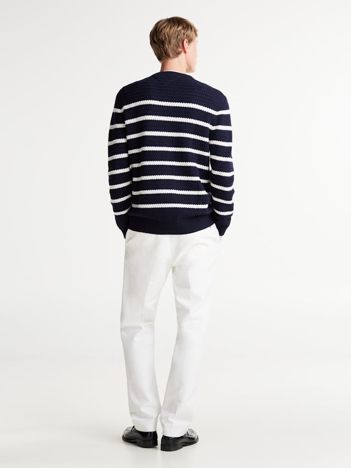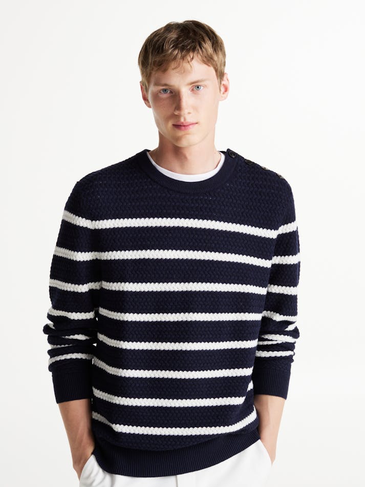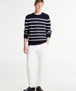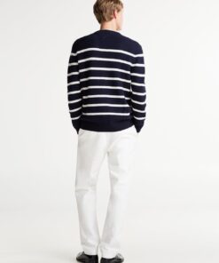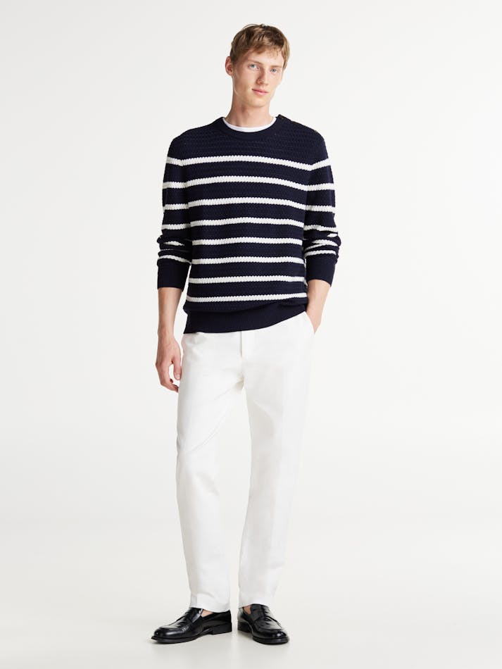 Combining soft materials in neutral colours, easy closures and clean lines, the Smart Casual collection is tailor-made for professional days and informal nights. This cosy crew-neck jumper features an eye-catching all-over stripe design ? crafted with a touchable cotton and wool blend.