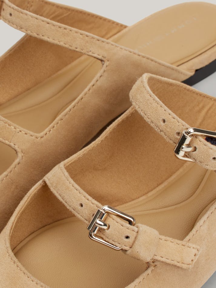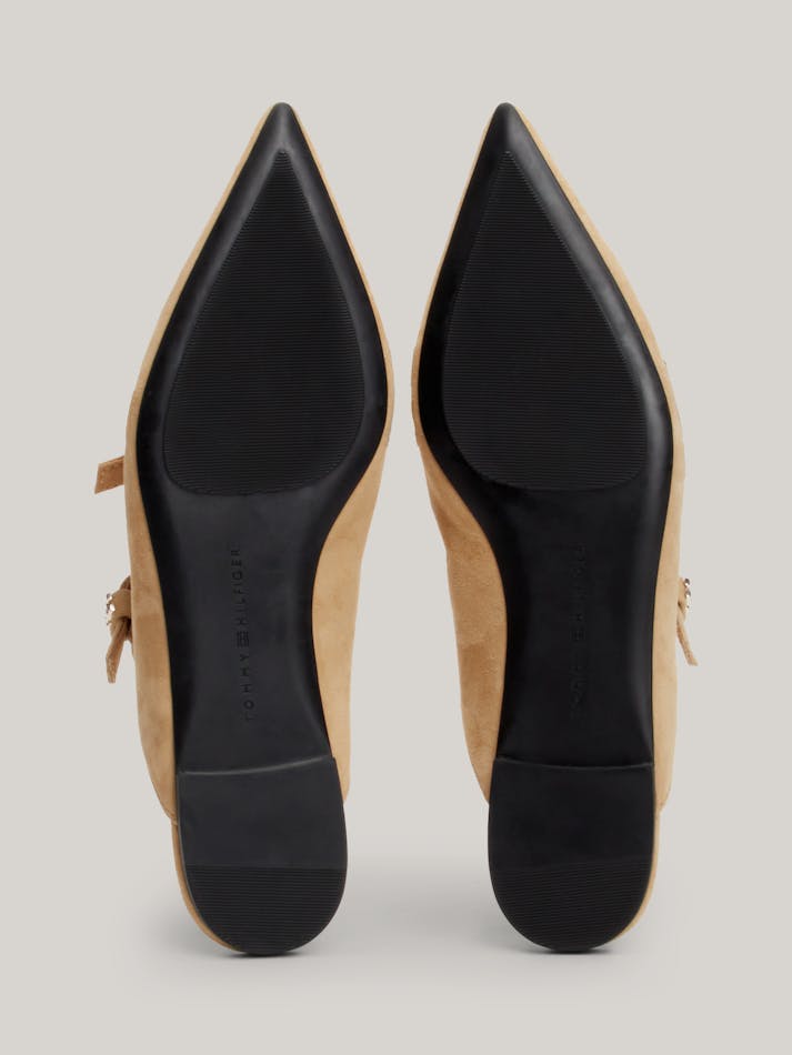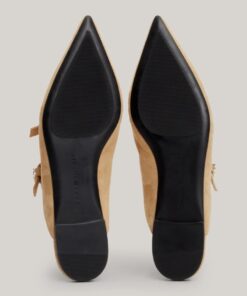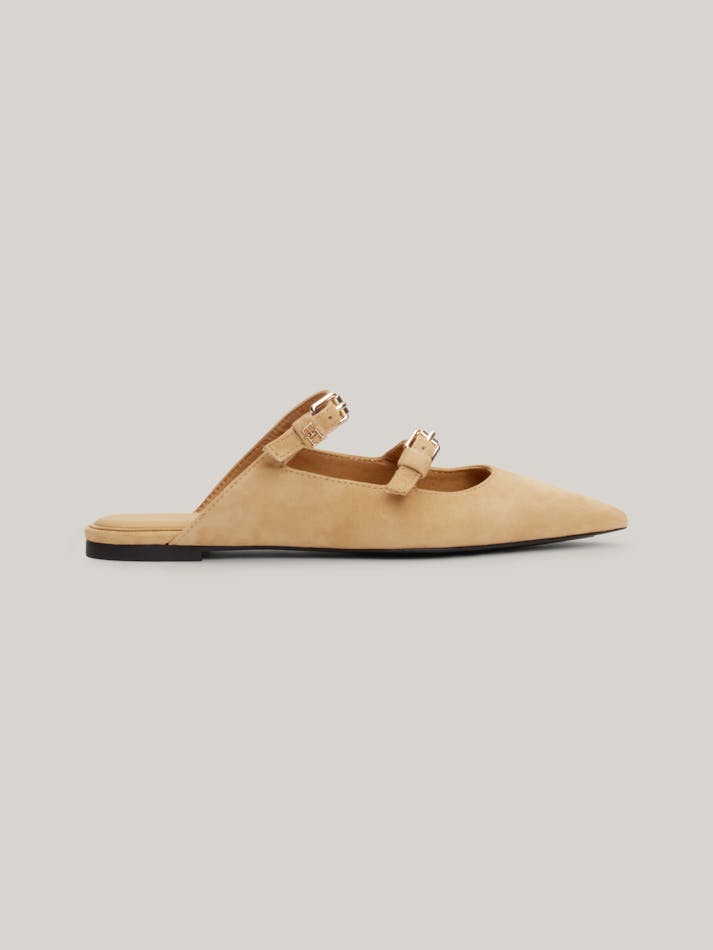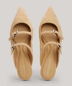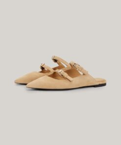 These elegant slip-on mules are crafted from soft suede with a feminine pointed toe and a luxe TH monogram plaque.