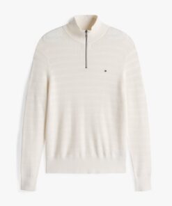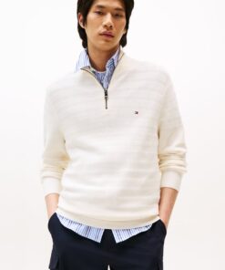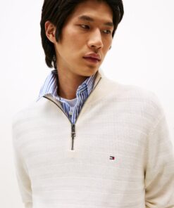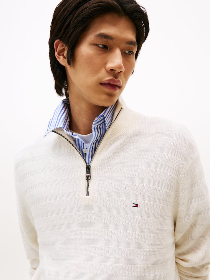 This pure cotton contemporary jumper features a striking textured stripe design, complemented by a quarter-zip neck and rib-knit details.
