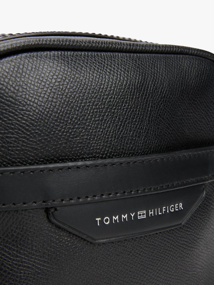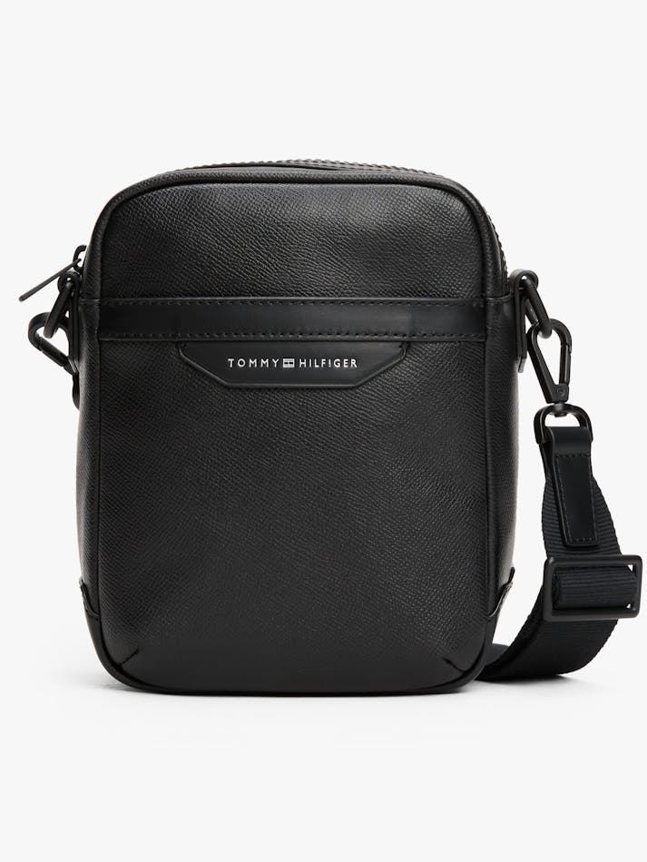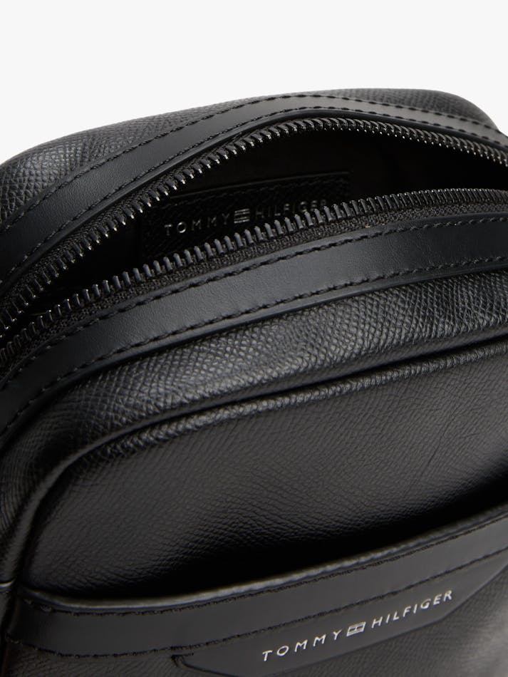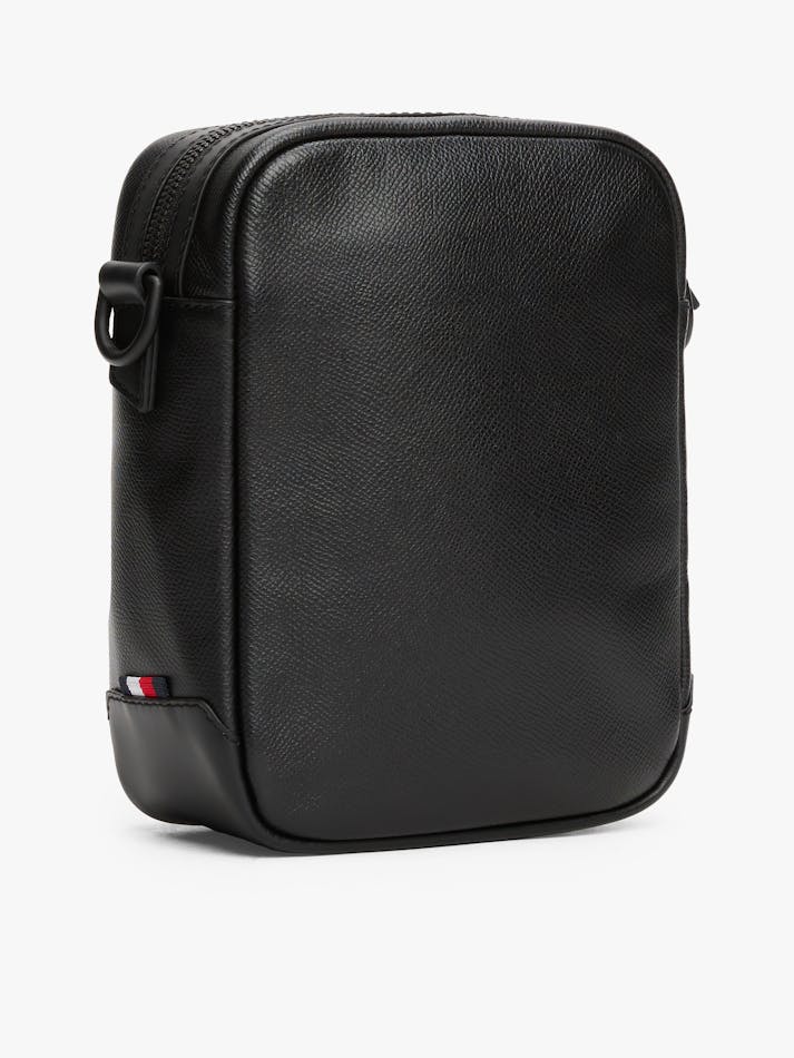 This leather reporter bag, featuring an adjustable crossbody strap and multiple pockets, combines a compact size with practicality and style.