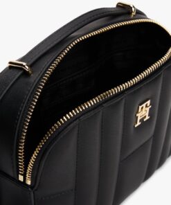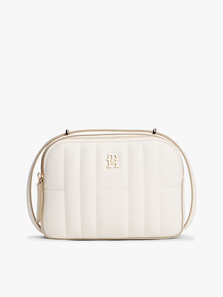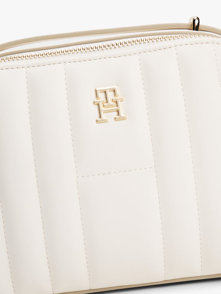 This clutch-style crossbody camera bag is compact yet luxurious with its plush quilted flag design and gleaming TH monogram plaque decoration.