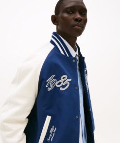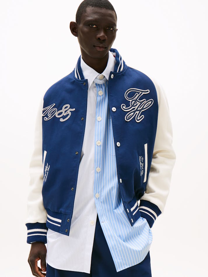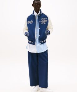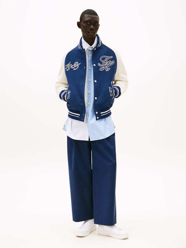 A new American prep wardrobe, presented at New York Fashion Week. Channel edgy collegiate vibes by layering this oversized varsity jacket with its prominent back logo over loosely fitted shirts and trousers.