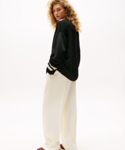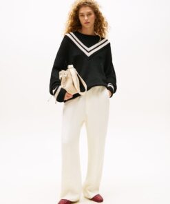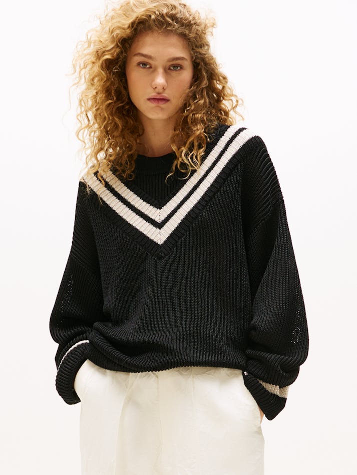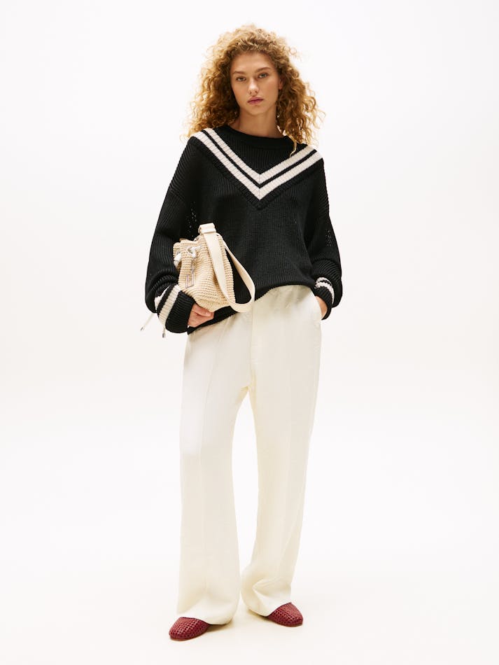 A new American prep wardrobe, presented at New York Fashion Week. Style this oversized contrast stripe jumper with breezy wide-leg trousers for a preppy take on coastal chic this season.