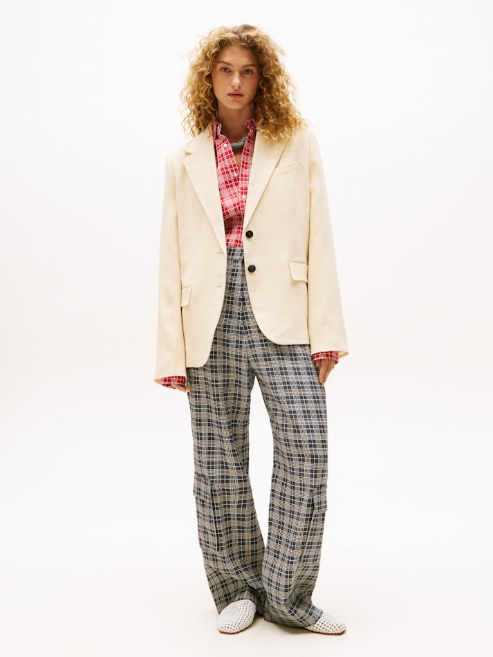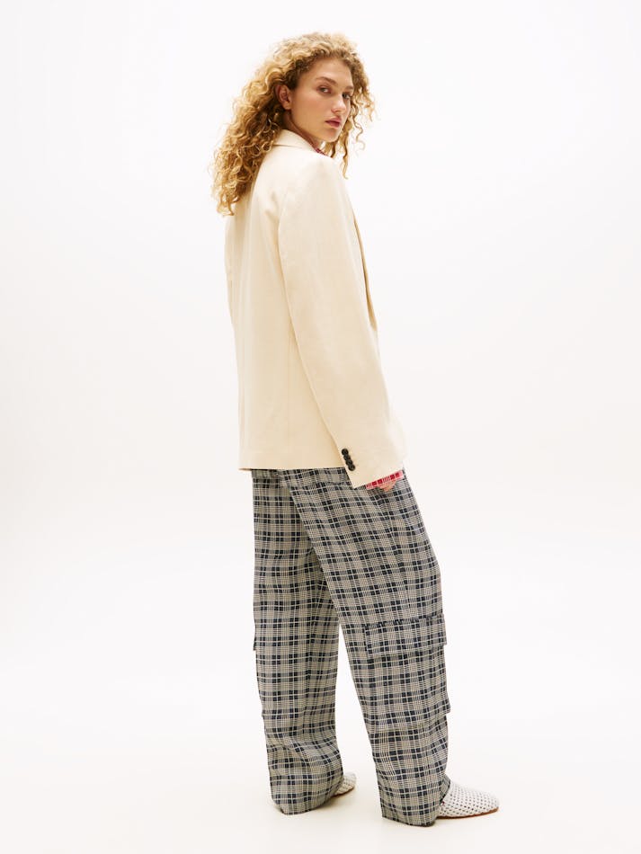 A new American prep wardrobe, presented at New York Fashion Week. Pair this oversized linen blazer with wide-leg cargo trousers for a tailored look that feels contemporary and fresh.