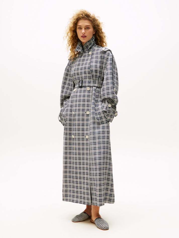 A new American prep wardrobe, presented at New York Fashion Week. Covered in a statement check from head to toe, this oversized trench coat with a belted waist is perfect for seasonal layering.