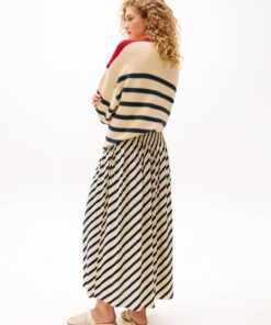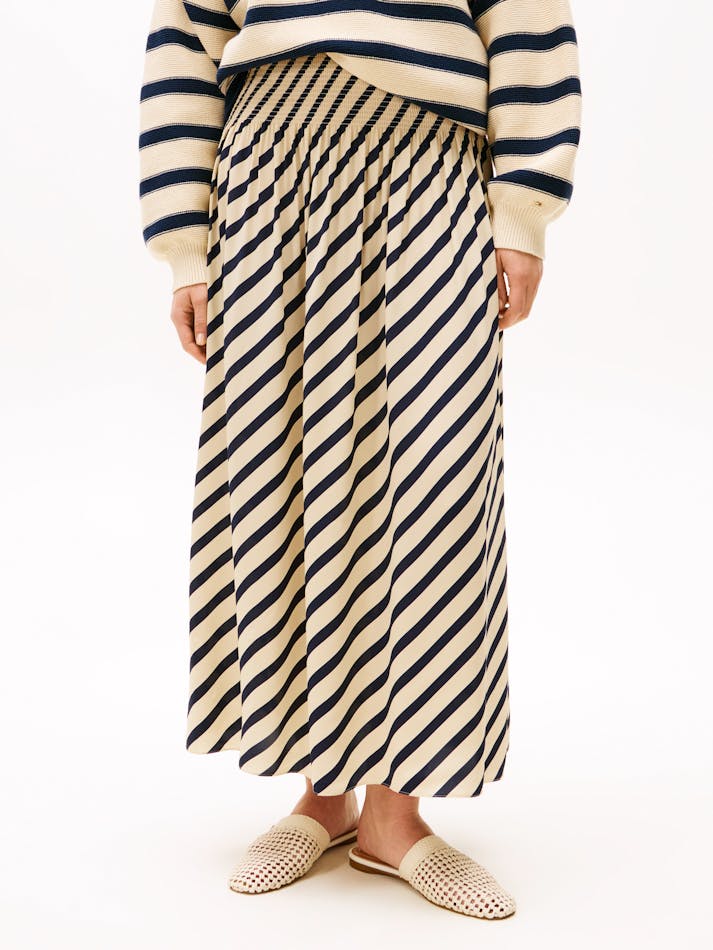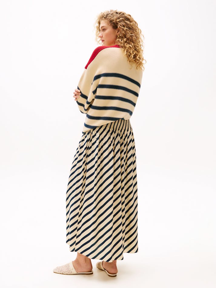 Sofia Richie Grainge lives the everyday twist in Tommy Hilfiger’s most covetable Spring pieces. This maxi skirt boasts a timeless Breton stripe design, complemented by pleating that creates a graceful and flowing silhouette.