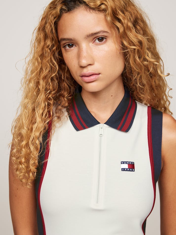 This fitted mini-length dress delivers retro-inspired sports styling thanks to side stripes and a contrast polo collar with a zipped neckline.