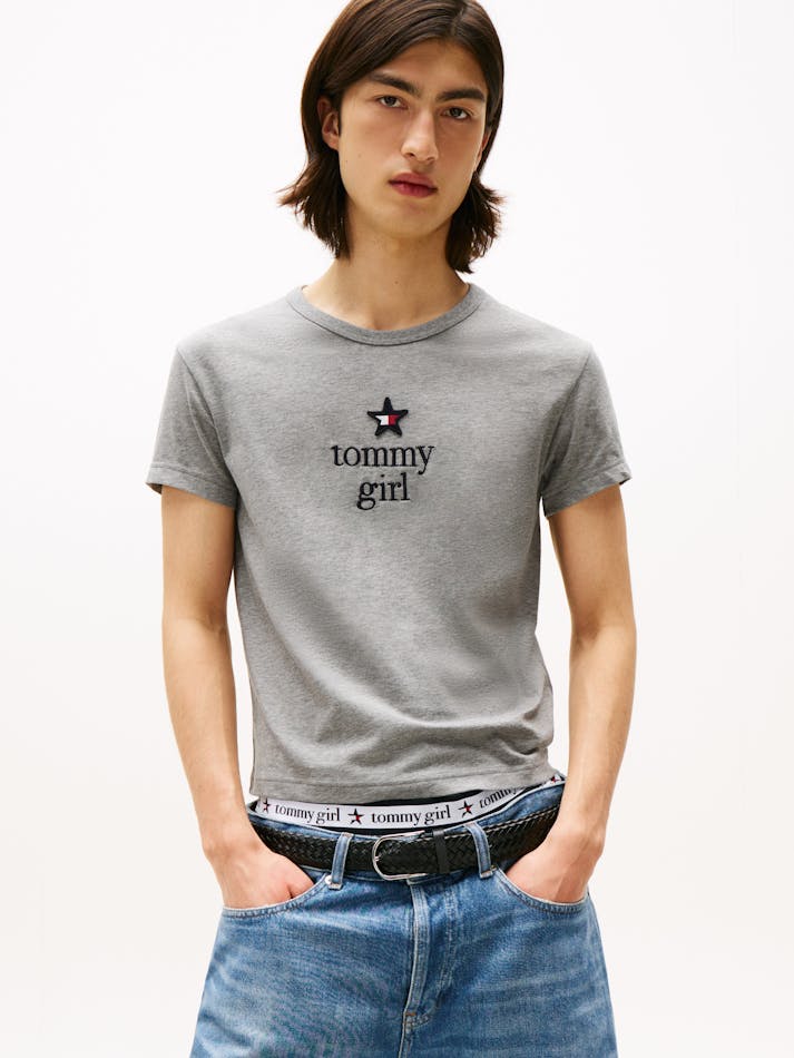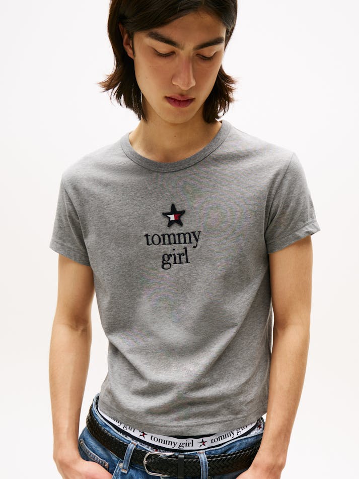 90s spirit. Modern style. Embrace easy-going vibes in this stretch cotton tee, featuring slightly dropped shoulders and a striking Tommy Girl graphic on the chest.