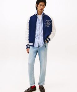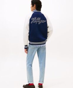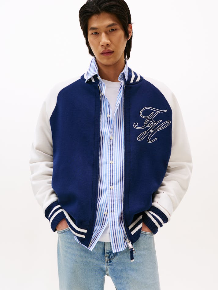 This varsity-style bomber jacket in a premium cotton cashmere blend knit features embroidered script logos on the chest and back.