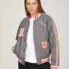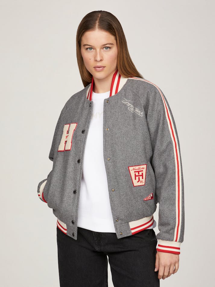 Blending tradition with trend, this varsity inspired bomber jacket features a classic baseball collar and snap button front closure. Striped rib knit trims and branded patches on the chest and hip add a touch of timeless appeal.